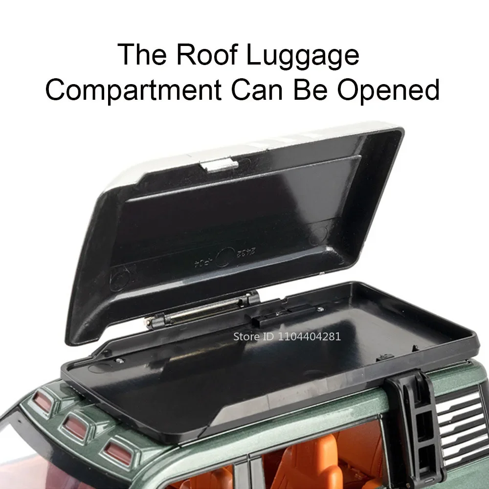 Immerse yourself in the realistic charm of this meticulously crafted 1:24 alloy SUV model, perfect for collectors and enthusiasts alike. Featuring a rugged boxy design, the vehicle showcases a deep metallic green finish with contrasting black accents and detailed honeycomb grille, framed with silver. Its sharp lines and vented hood enhance the off-road aesthetic, while the expansive windshield reveals luxurious orange-brown leather-like seats with headrests. The side mirrors are mounted with precision, and the roof is equipped with a silver cargo rack with small red lights for added authenticity. Measuring approximately 20.5 x 8.6 x 9.5 cm, this model combines durability with intricate detail, embodying a true high simulation ride for display, play, or gifting.