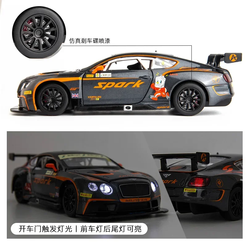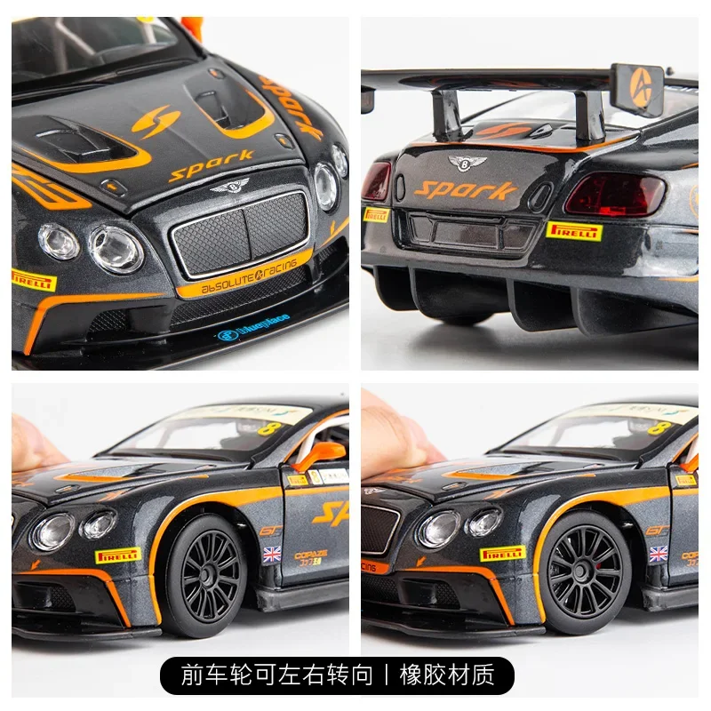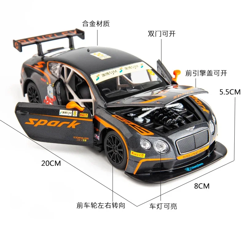 This meticulously crafted 1:24 scale model of the Bentley Continental GT3 racing car captures the essence of real racing dynamics. The sleek, aerodynamic body is finished in an eye-catching metallic grey with vibrant orange accents that highlight its performance pedigree. With intricate details, including a detailed engine compartment visible through the opening hood, and a well-appointed racing interior, this model is perfect for any collector. The black multi-spoke alloy rims further enhance the sporty aesthetic, ensuring it stands out in any collection. This replica also boasts racing sponsorship logos and a prominent “8” marking, embodying the spirit of competition and speed in a compact format.