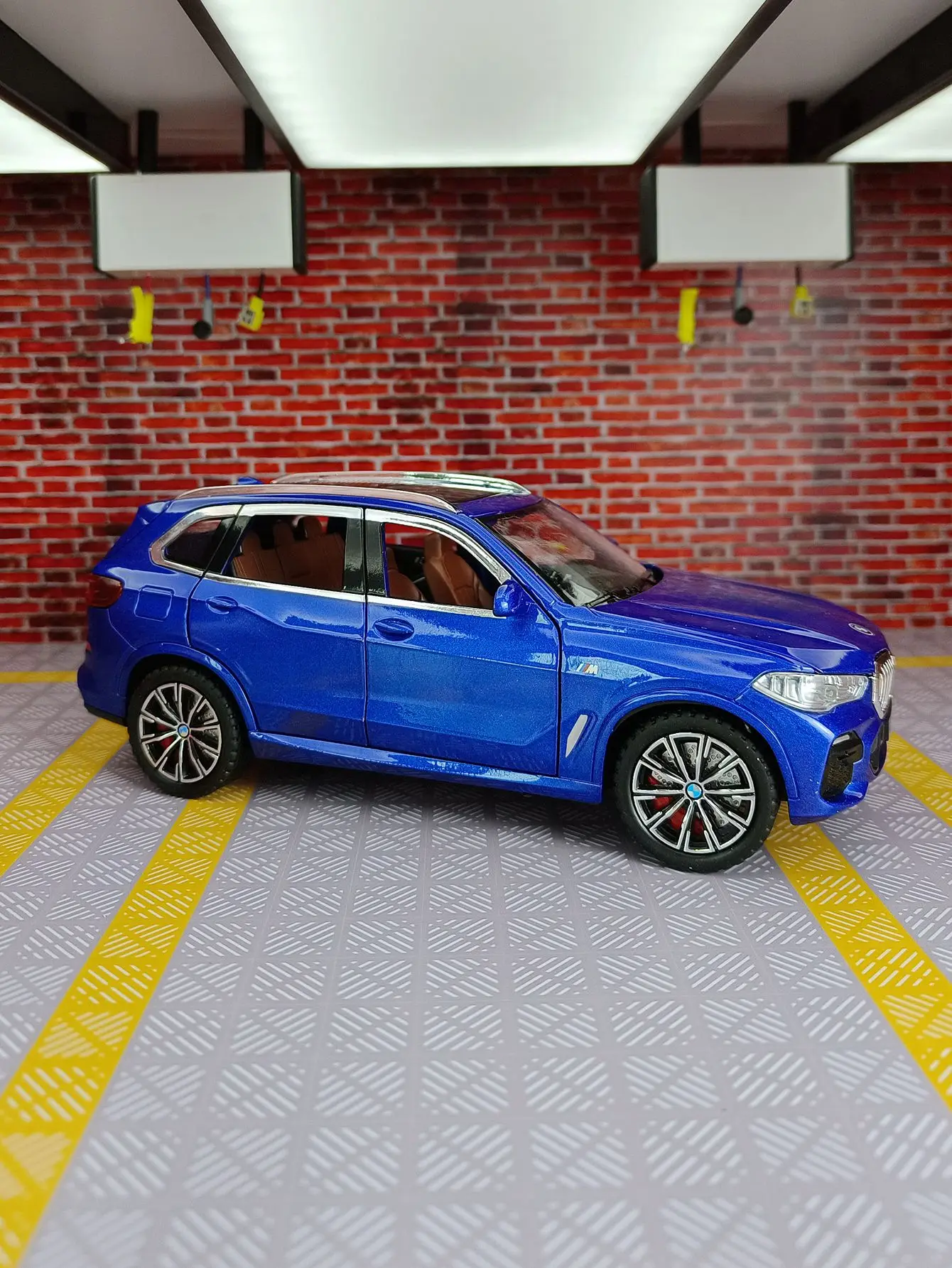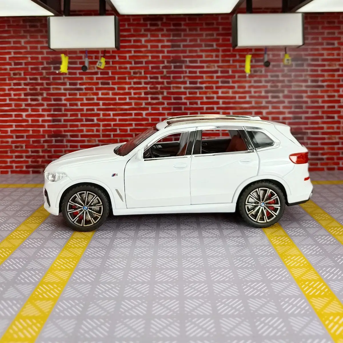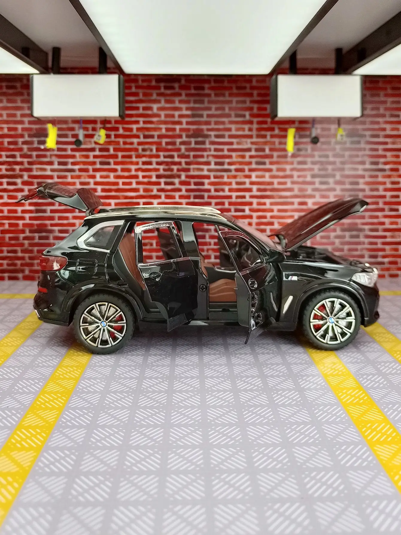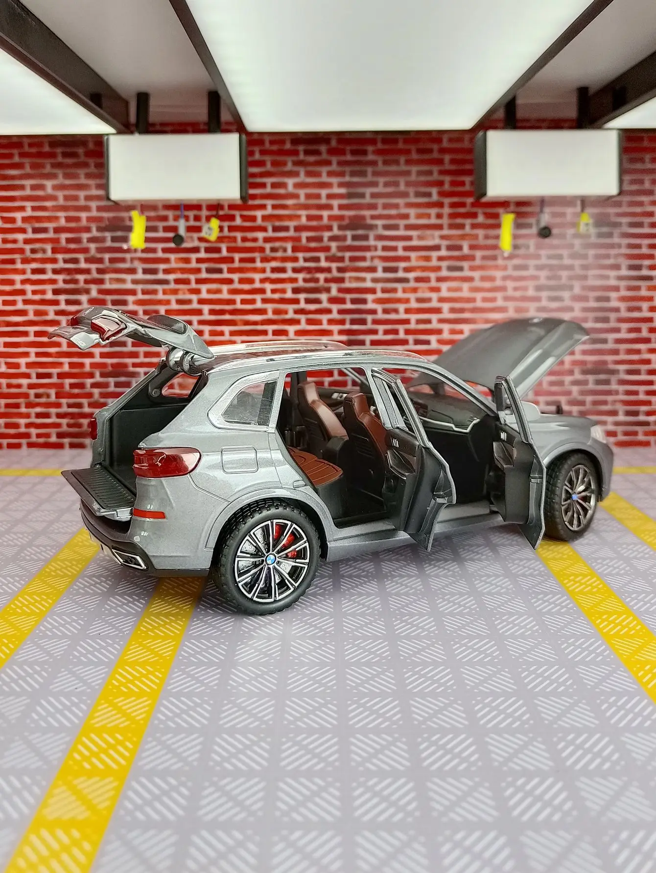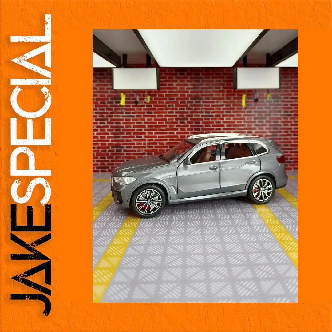 Experience the exquisite detail of the 1:24 Miniature BMW X5 Alloy Model Car, expertly crafted from diecast alloy for a stunning finish in metallic gray. This collectible toy captures the iconic sporty design of the BMW X5, featuring defined curves and edges, detailed alloy multi-spoke wheels with red brake calipers, and clear plastic windows that reveal a finely detailed brownish-beige interior. Precision-rendered front grille and headlights enhance its realistic aesthetics, while the silver-finished roof adds a touch of elegance. This scale model operates on a button battery, providing sound and light functionalities to delight enthusiasts.
