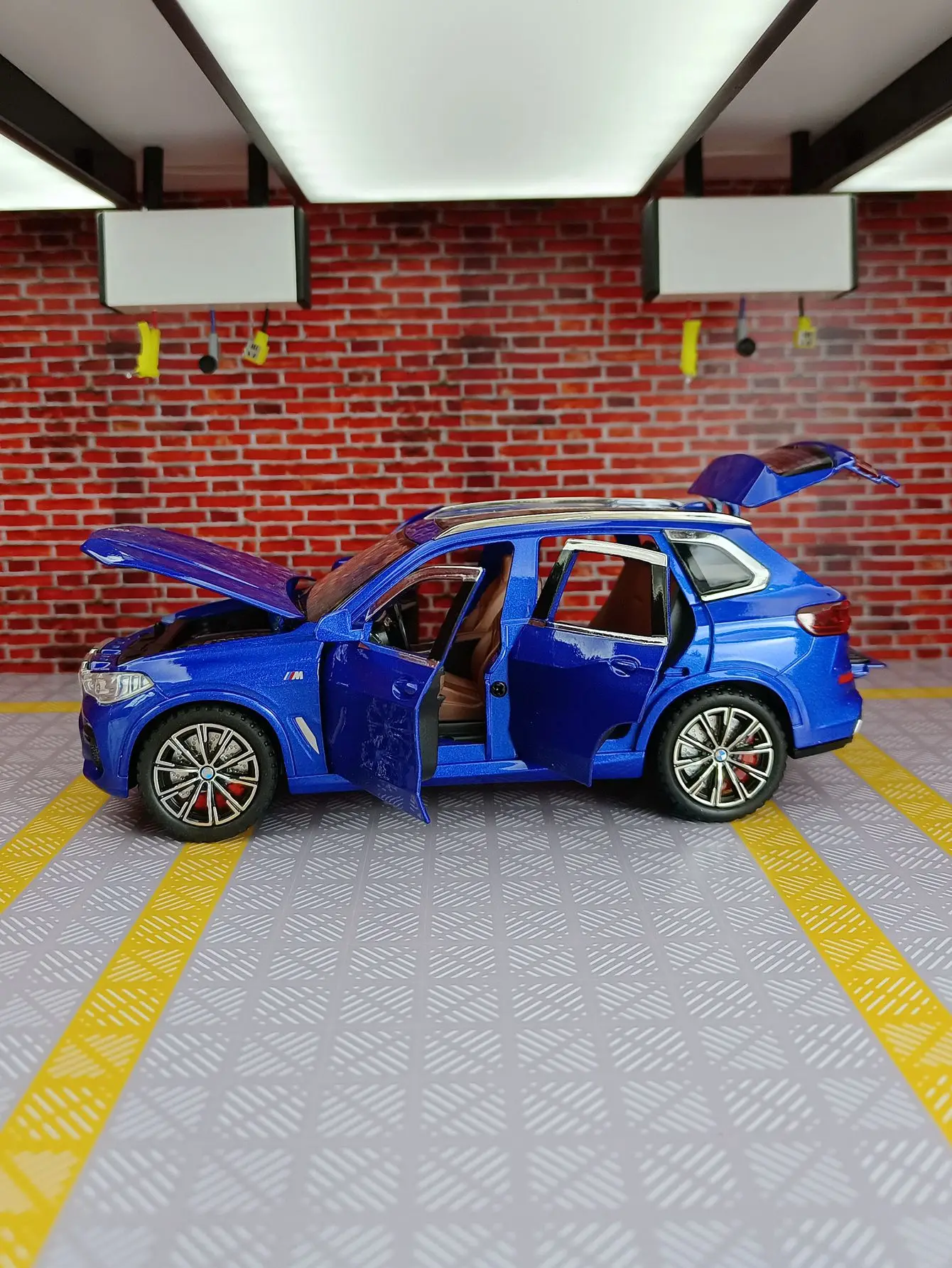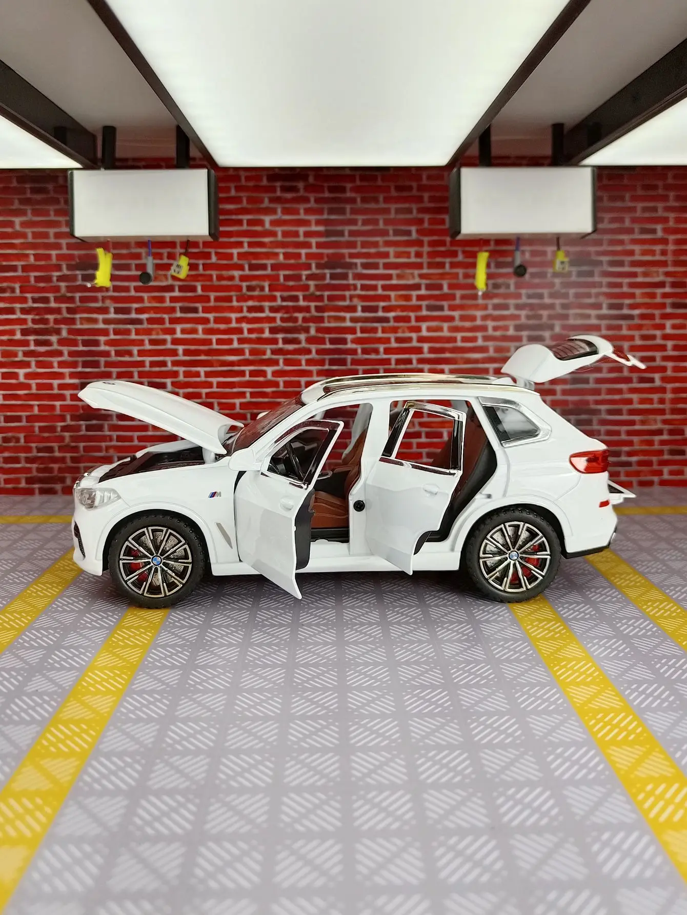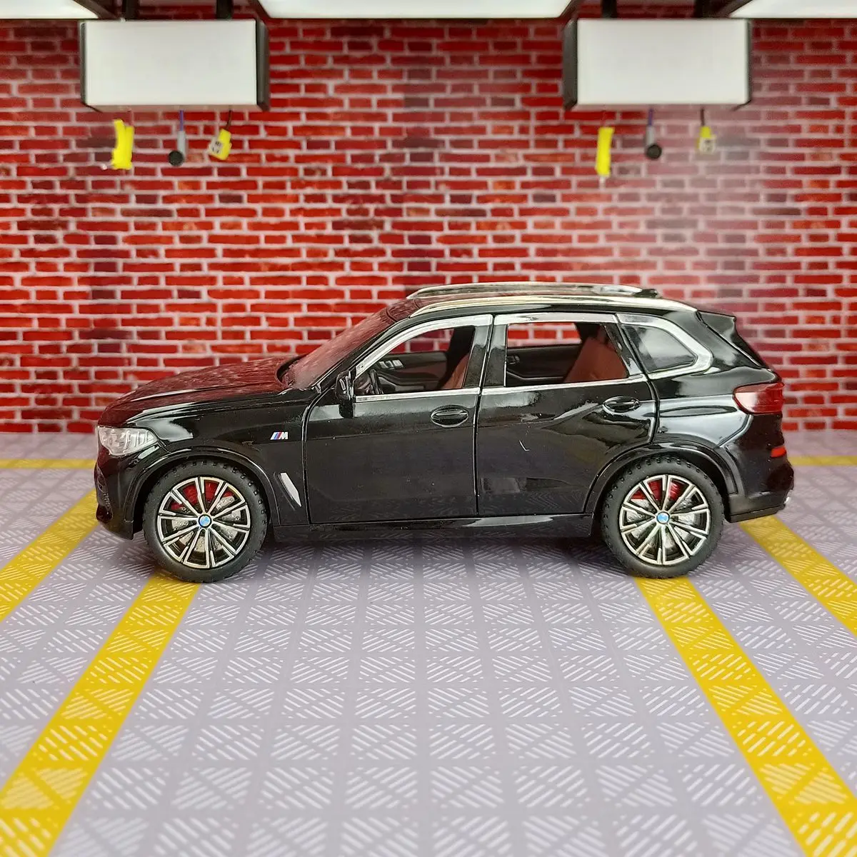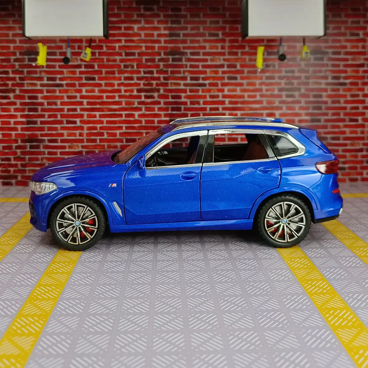 Experience the exquisite detail of the 1:24 Miniature BMW X5 Alloy Model Car, expertly crafted from diecast alloy for a stunning finish in metallic gray. This collectible toy captures the iconic sporty design of the BMW X5, featuring defined curves and edges, detailed alloy multi-spoke wheels with red brake calipers, and clear plastic windows that reveal a finely detailed brownish-beige interior. Precision-rendered front grille and headlights enhance its realistic aesthetics, while the silver-finished roof adds a touch of elegance. This scale model operates on a button battery, providing sound and light functionalities to delight enthusiasts.