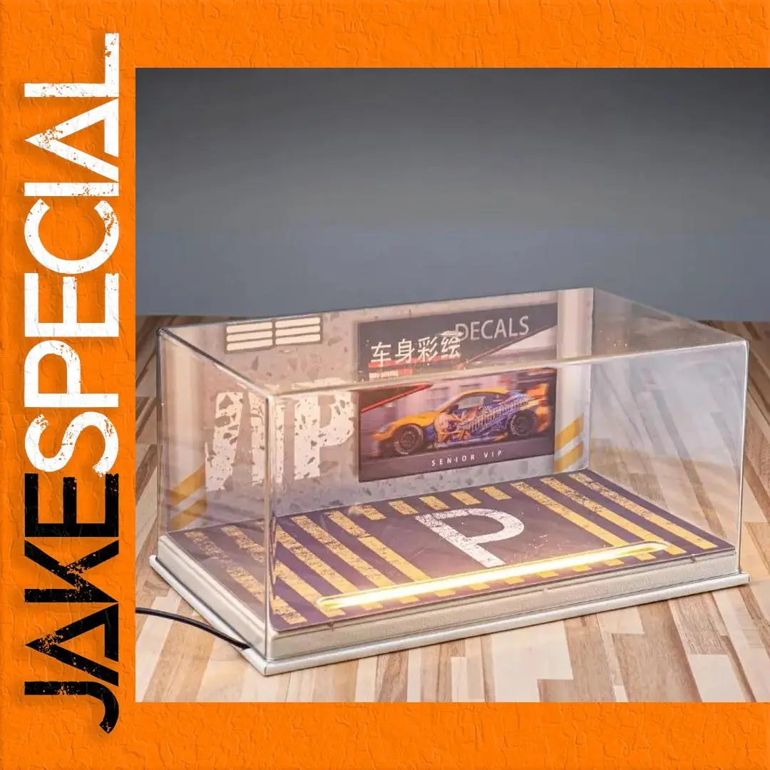 Experience the perfect blend of functionality and aesthetic appeal with this transparent display cabinet for 1:24 car models. Showcasing your prized collection has never been more stylish, thanks to its clear PVC sides that offer an unobstructed view from any angle. The cabinet features a captivating striped pattern of purple and yellow on its base, complemented by a central “P” that adds a unique touch. Driven by creativity, the illustrated backdrop of a stylized race car and the VIP decal enhance the exhibit's visual charm. The built-in lighting beautifully illuminates your model for a spectacular display, creating an artistic focal point in your home.