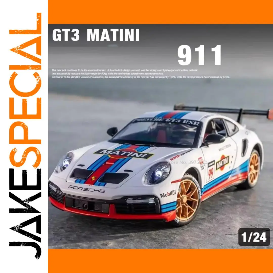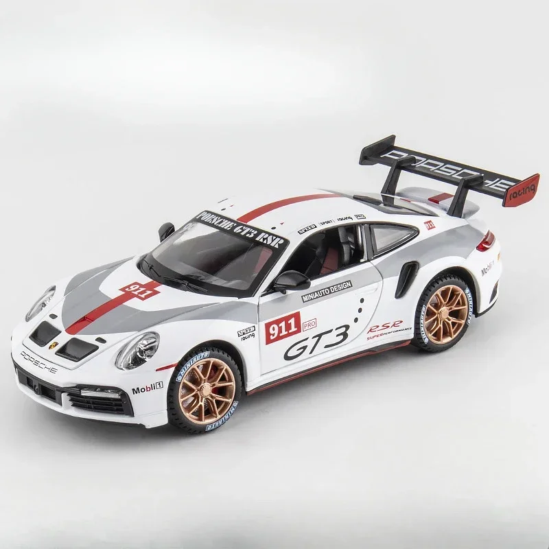 Experience the thrill of racing with this stunning 1:24 diecast Porsche 911 GT3 RSR model, crafted with meticulous detail to evoke high-performance excitement. Featuring a sleek aerodynamic design, the model boasts a striking white base accented by bold racing stripes in red, light blue, and dark blue that run from the front hood to the rear, capturing the essence of motorsport heritage. Its surface includes intricately detailed vents, headlights with clear lenses, and a black front bumper with a wide grille. The prominent black rear wing with orange endplates adds an aggressive stance, complemented by gold-colored racing wheels with rubber tires. The model’s high simulation quality, opening doors, pull-back mechanism, lighting, and sound features make it a captivating collector's item or a dynamic display piece.