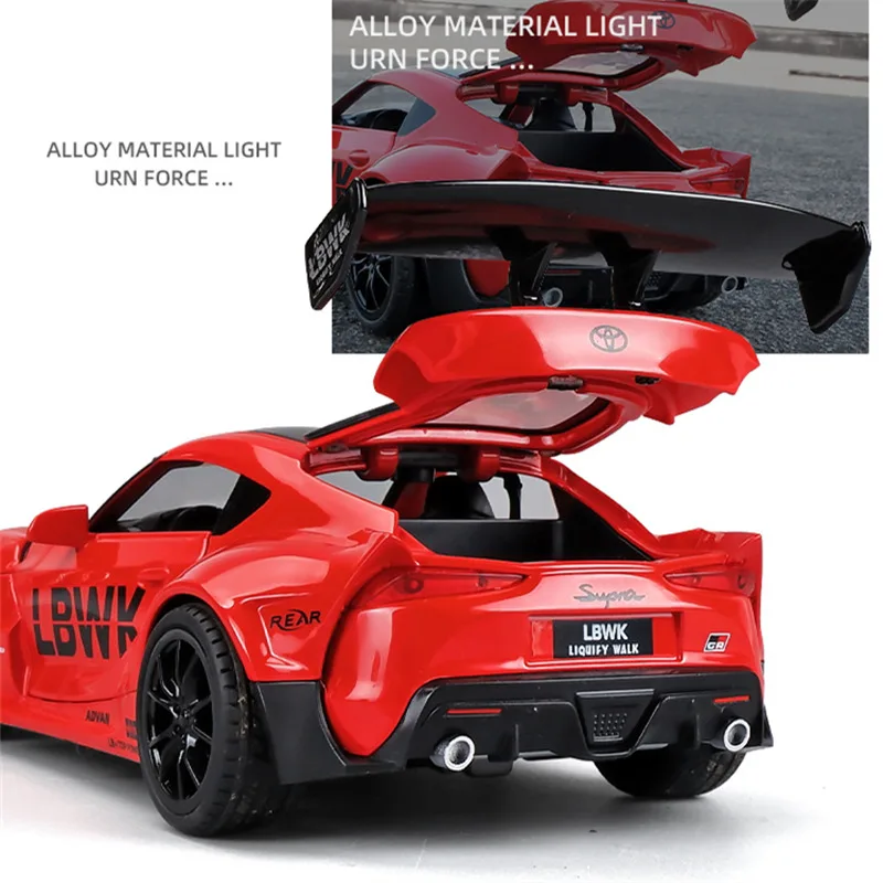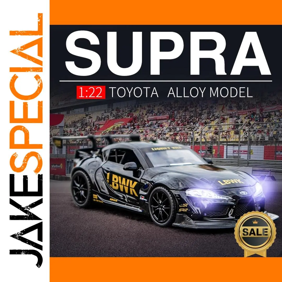 This stunning 1:24 scale Toyota Supra diecast model is an exquisite blend of sporty aesthetics and intricate detail. Finished in a sleek black that accentuates its aerodynamic profile, this model stands out with bold yellow “LBWK” graphics and racing decals, capturing the essence of the iconic sports car. With large multi-spoke black alloy wheels and a prominent rear wing, it conveys both elegance and performance. Its realistic lighting effects mimic actual vehicle lights, making it a true collector's dream. Crafted from a combination of durable alloy and plastic, this model seamlessly combines artistry and authenticity, perfect for any automotive enthusiast's display.