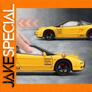 This stunning diecast model captures the iconic Honda Acura NSX MK1 NA1 in a vibrant yellow finish, highlighted by its aerodynamic contours and sleek design. The detailed black graphics featuring the racing sponsorships “ENDLESS” and “Spoon E” enhance its sporty appeal. With meticulously crafted black alloy wheels accented in red, and visible brake rotors, this model exemplifies realism and precision. Designed for both display and play, it features sound and light capabilities for an engaging experience, though batteries are not included. Constructed from durable diecast metal and plastic, this model is perfect for collectors and enthusiasts alike.