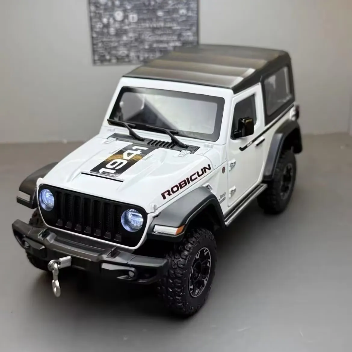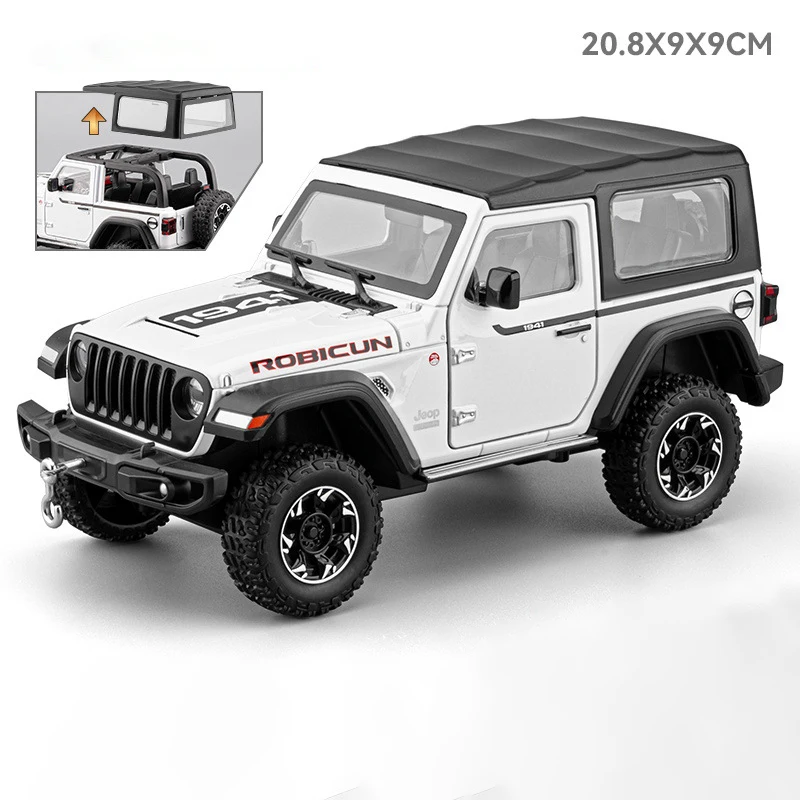 Bring your collection to life with this highly detailed 1:24 scale diecast model of a Jeep Wrangler Rubicon, crafted from alloy and plastic for durability and realism. Featuring striking black accents with a white body, the model showcases a rugged off-road design, including a hardtop roof, large knobby tires with black alloy rims, and intricate details like molded door handles and fender flares. Equipped with simulation sound and lighting functions, it offers an immersive experience that replicates a real off-road adventure. Perfect for collectors aged 14 and above, this high-quality replica is available in blue, black, yellow, and classic white, making it a perfect display or gift item.