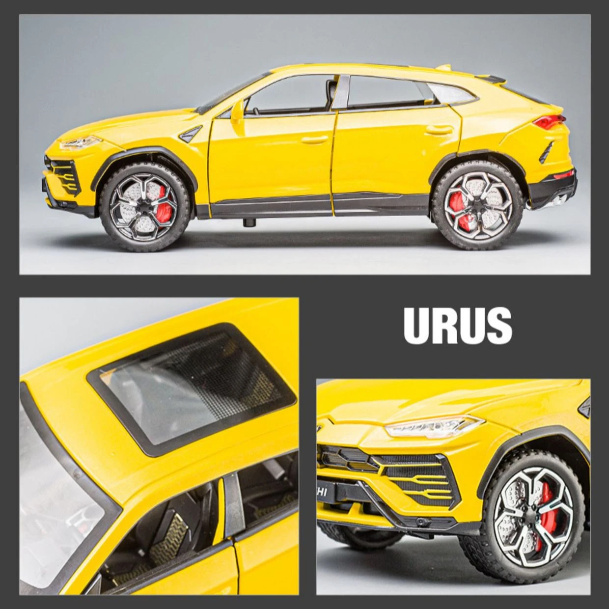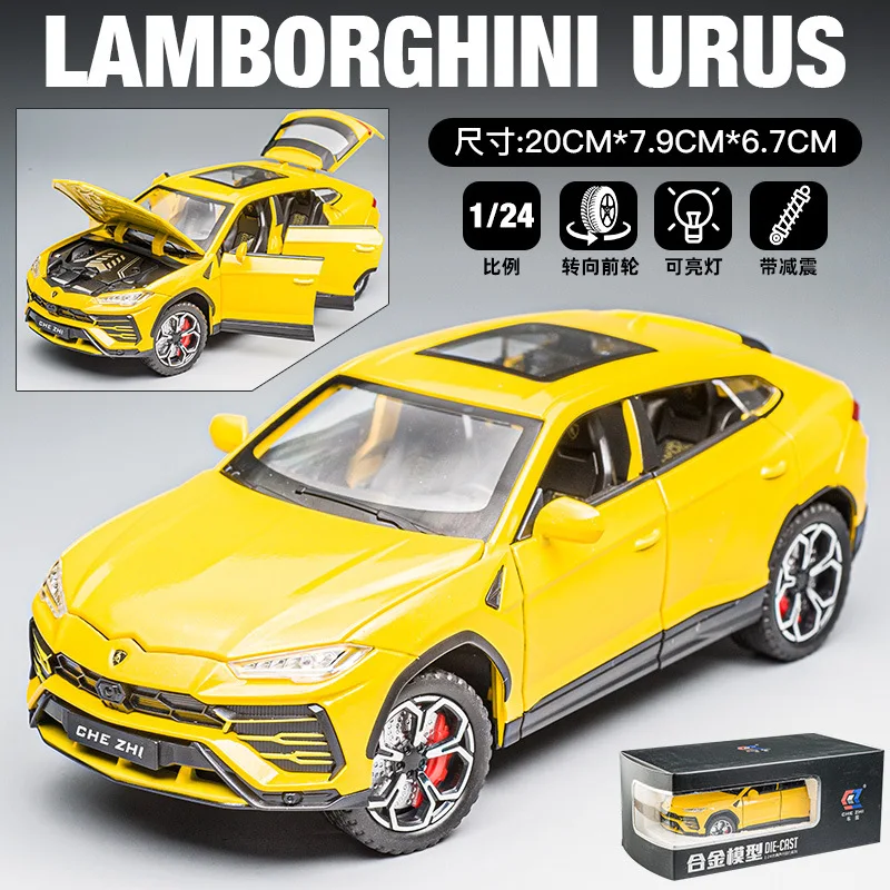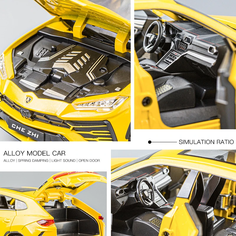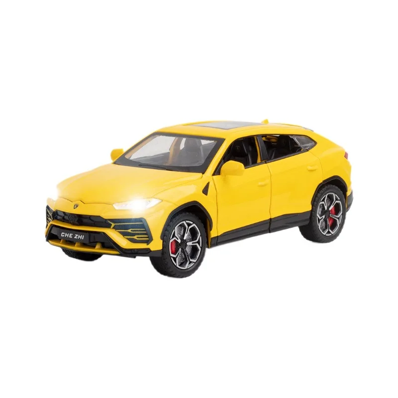 Experience the striking realism of this 1:24 scale diecast alloy and plastic SUV model, available in vivid yellow, black, or white, with options including box packaging. Crafted with fine detail, it features functional opening doors, pull-back motion, and integrated sound and light effects that bring the vehicle to life. Measuring approximately 1:24 in scale with proportionate dimensions, this model combines durable materials with intricate craftsmanship, making it an ideal collectible for enthusiasts aged 14 and above. Its sporty, aerodynamic design, bold front grille, narrow headlights, black multi-spoke alloy wheels with red brake calipers, and textured tires capture the essence of an upscale SUV, perfect for display or as a gift.