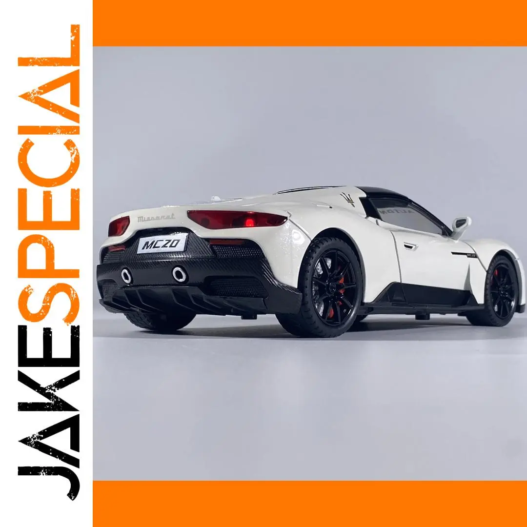 Imagine owning a high-quality replica of the iconic Maserati MC20 Convertible, perfectly capturing its sleek, aerodynamic design. This diecast model vividly reflects the real car’s sporty essence, with a bright white body accented by bold black components on the front splitter, side skirts, roof, and rear diffuser. It features striking red taillights, a detailed Maserati badge, and a textured carbon-fiber section on the bumper, emphasizing luxury and performance. The black alloy wheels showcase red brake calipers visible through the spokes, providing a realistic finish. Transparent windows reveal an intricately detailed interior, making this piece a premium collectible. Whether displayed on your desk or shelf, it radiates style and craftsmanship, inspiring admiration for automotive excellence.