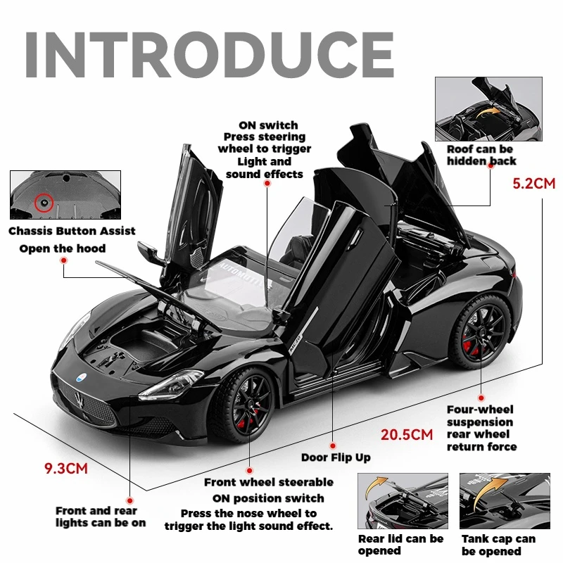 Experience the thrill of owning this highly realistic 1:24 scale diecast model of the Maserati MC20 Convertible. Crafted with high-quality diecast metal, it showcases intricate details such as aerodynamic curves, a glossy black finish, and realistic lighting. The model features open scissor doors, transparent windows revealing a detailed interior, and wheels with sporty rims that capture the essence of high-performance luxury. Versatile in use, it doubles as a collectible ornament, racing game piece, or a captivating display for enthusiasts. Available in multiple vibrant colors, including blue, red, black, and white, this model reflects refined craftsmanship and sporty elegance, perfect for passionate collectors or as a statement piece.