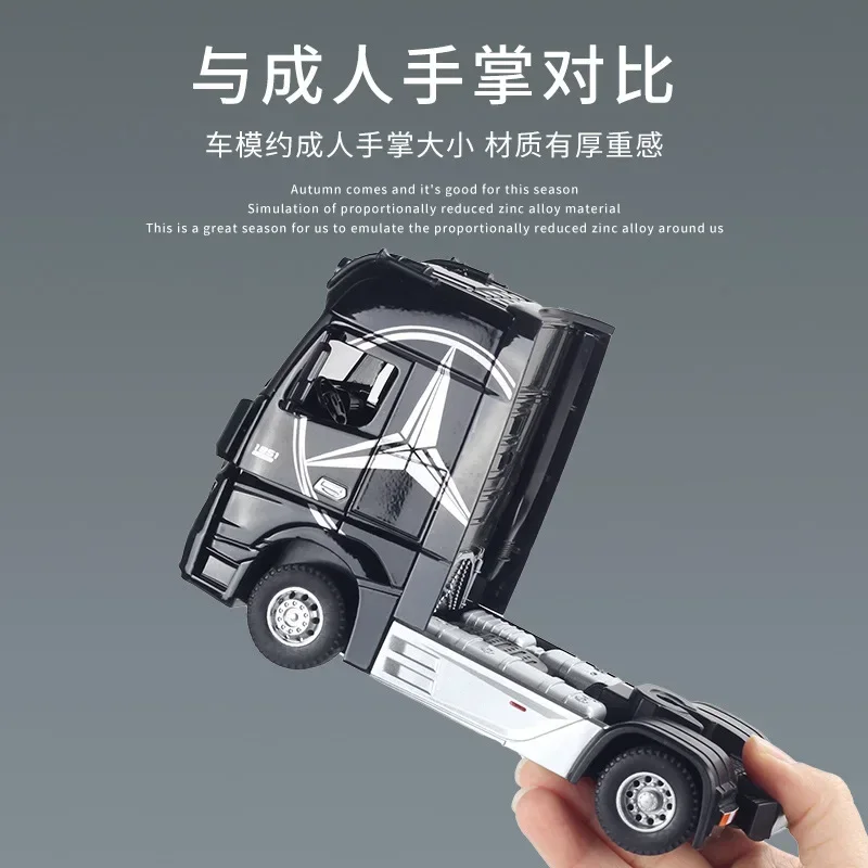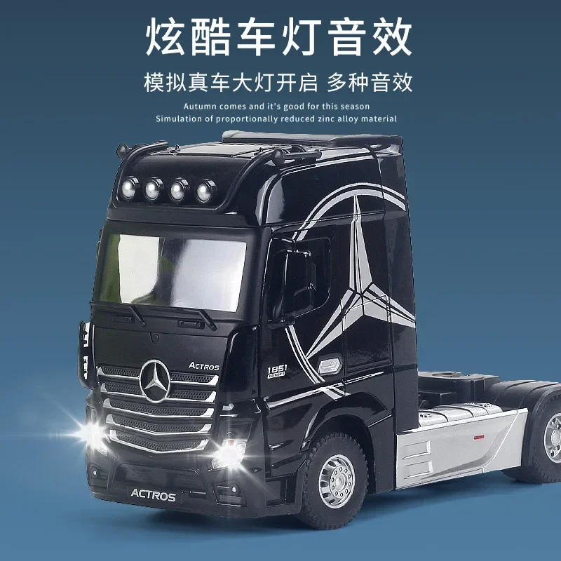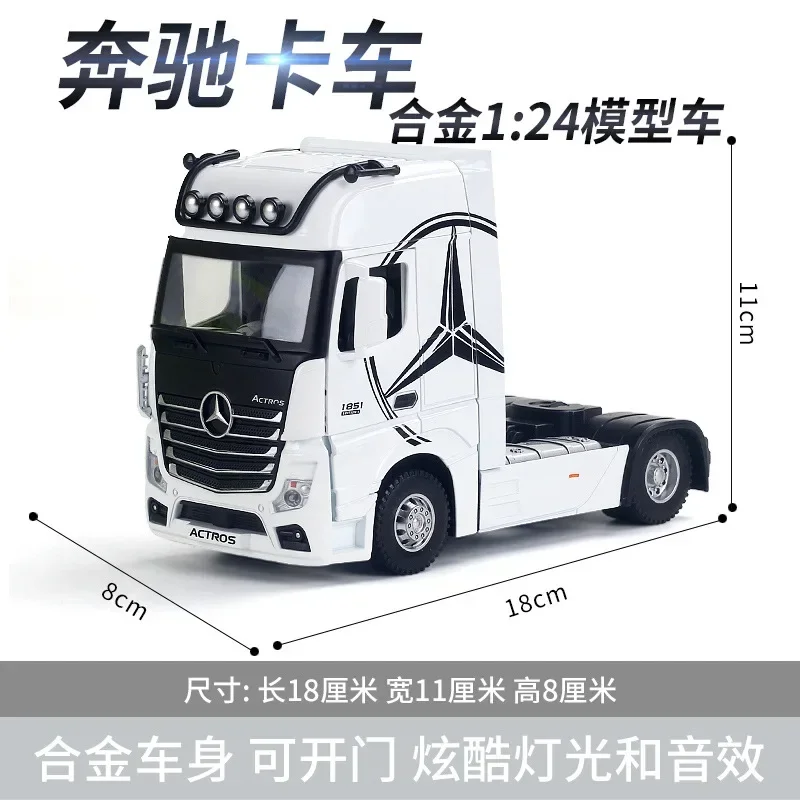 Experience the craftsmanship and attention to detail of this high-quality Mercedes-Benz ACIROS 1:24 scale diecast truck. Crafted from alloy, it boasts a sleek white finish, complemented by black accents and decorative lines that accentuate its modern, streamlined silhouette. The reflective surface highlights its polished, durable construction, perfect for display or collection. The front grille features horizontal slats with a prominent emblem, while the clear windshield and side mirrors add a lifelike touch. The wheels showcase metallic hubcaps with realistic tread, emphasizing the vehicle’s sturdy design. Equipped with sound and light effects, this model captures the essence of the real truck, making it an engaging addition to any enthusiast’s collection or a stylish display piece.