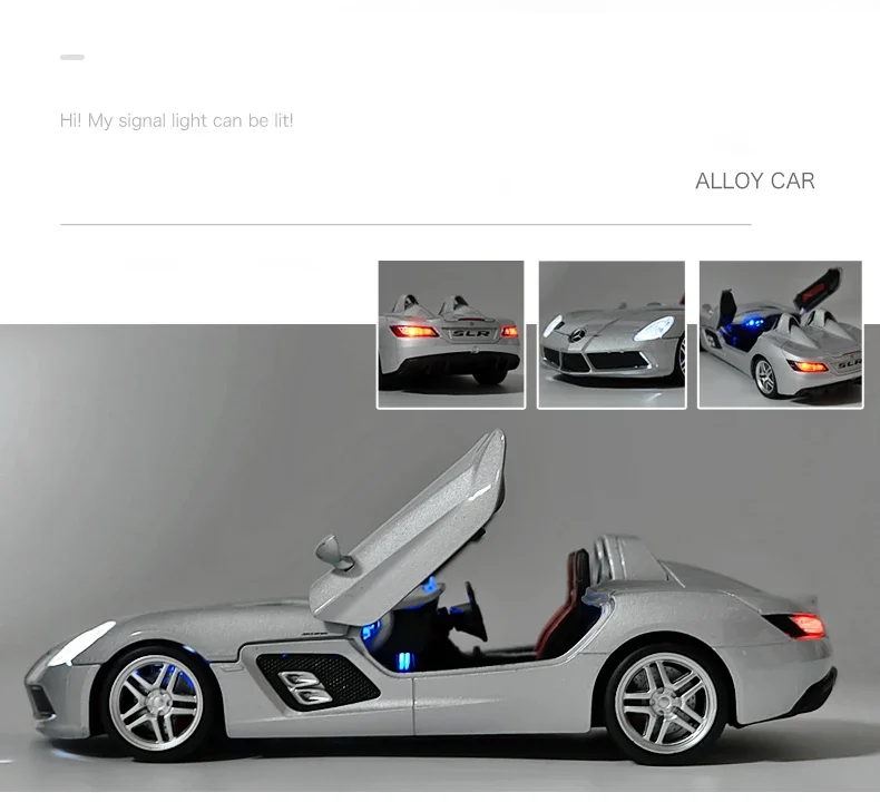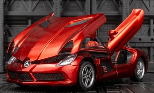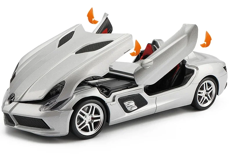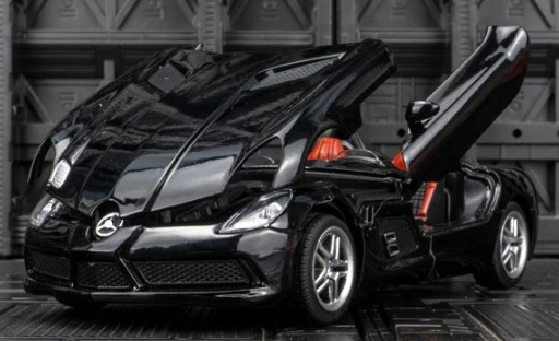 Experience the thrill of high-performance engineering with this highly detailed 1:24 scale diecast alloy model of the Mercedes-Benz SLR Stirling Moss. Available in striking colors including black, silvery, red, orange, and green, this meticulously crafted model features a sleek aerodynamic body with a glossy metallic finish, intricate grille design, and clear lens headlights. The open-top design reveals a vivid red interior with finely detailed seats and dashboard. Constructed from durable alloy and plastic, it’s perfect for collectors and enthusiasts aged 14 and above, showcasing a sporty, aggressive stance with precise craftsmanship that captures the essence of the legendary supercar.