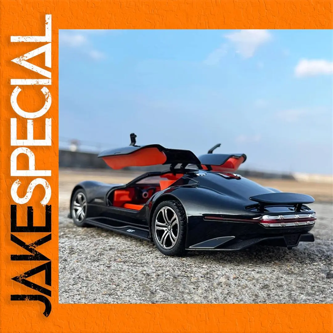 Experience the thrill of owning this highly detailed 1:24 scale diecast alloy sports car model, inspired by the legendary Mercedes-Benz Vision GT. Its sleek exterior finishes in glossy Bright Black, Matte Black, or elegant Silvery hues, highlighting smooth, aerodynamic lines that embody speed and agility. The model features a low-profile stance, a prominent rear wing/spoiler, and intricately crafted multi-spoke rims paired with low-profile tires for added realism. Inside, the vivid red interior contrasts sharply with the exterior, showcasing molded race-ready seats and detailed cockpit elements. Perfect for collectors and enthusiasts, this model also includes simulated sound and lighting effects, adding an extra layer of excitement to your display.