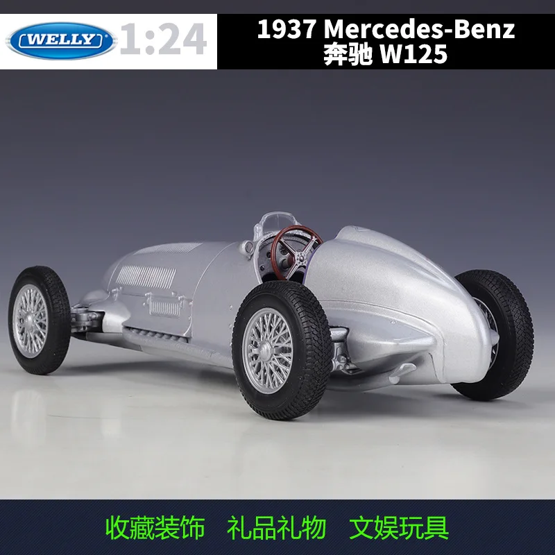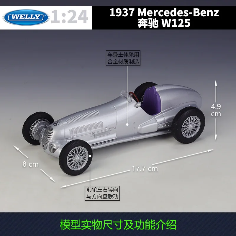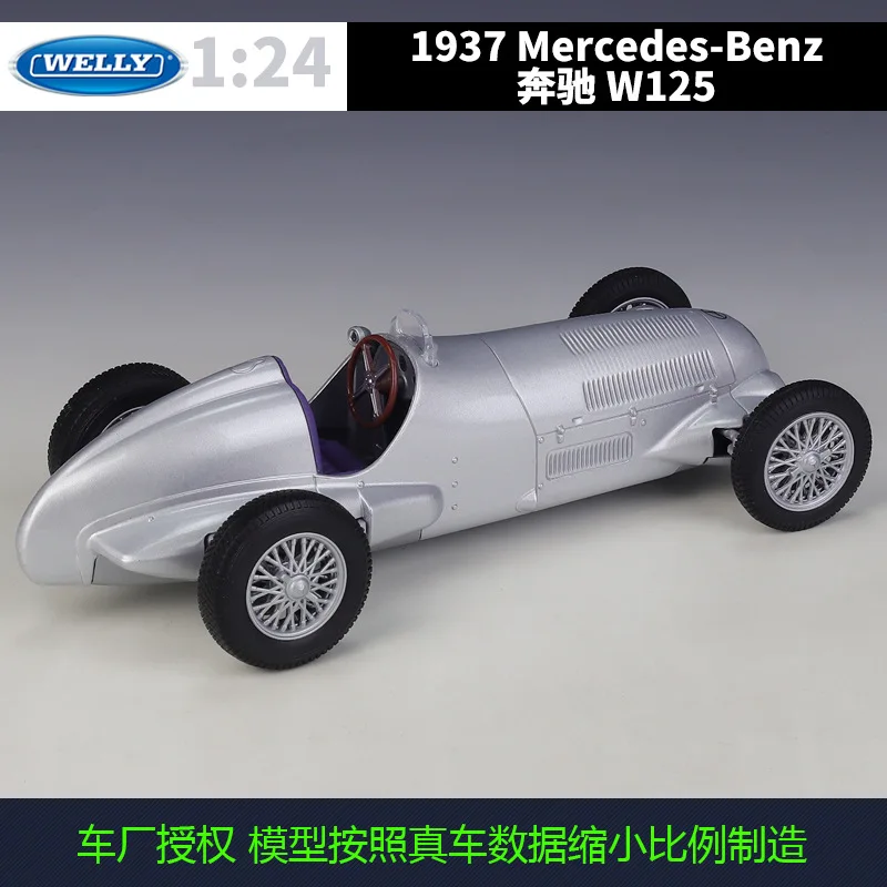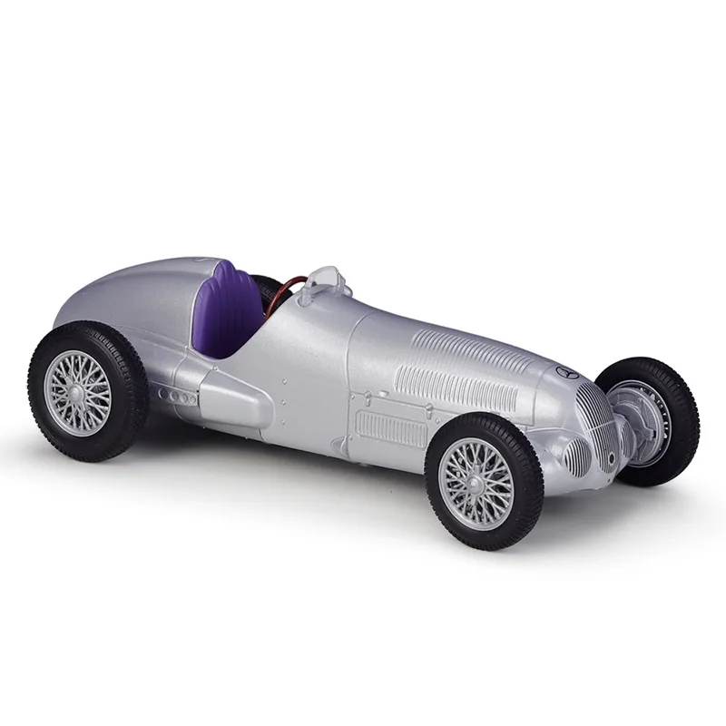- Meticulously crafted 1:24 scale diecast model in metallic silver, capturing authentic vintage racing aesthetics and detailed aerodynamic curves from the original 1937 Mercedes-Benz W125.