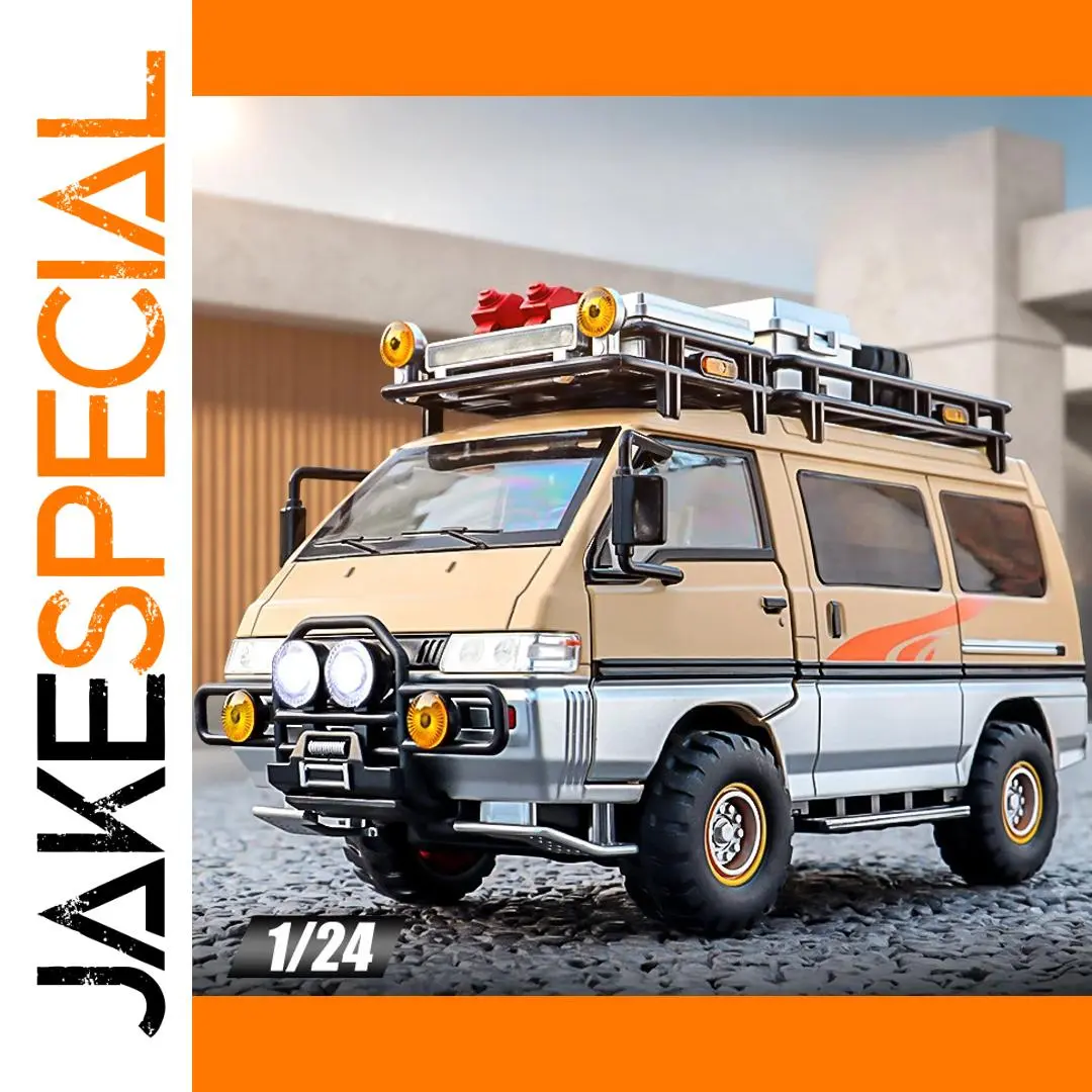 Immerse yourself in the adventure with this highly detailed 1:24 diecast Mitsubishi Delica model. Crafted from durable metal, it features rugged off-road tires, an authentic beige and silver finish, and a distinctive orange swoosh decal. The realistic front includes round headlights, fog lights mounted on a black bumper with a winch, and a clear windshield with black trim. The side features large tinted windows, black door handles, and rectangular side mirrors, all crafted with impressive precision. A roof rack with accessories like silver roof boxes and red jerry cans adds to its adventurous appeal. Equipped with sound and lighting effects, this model perfectly captures off-road camping vibes, offering a perfect collectible that evokes rugged exploration and craftsmanship.