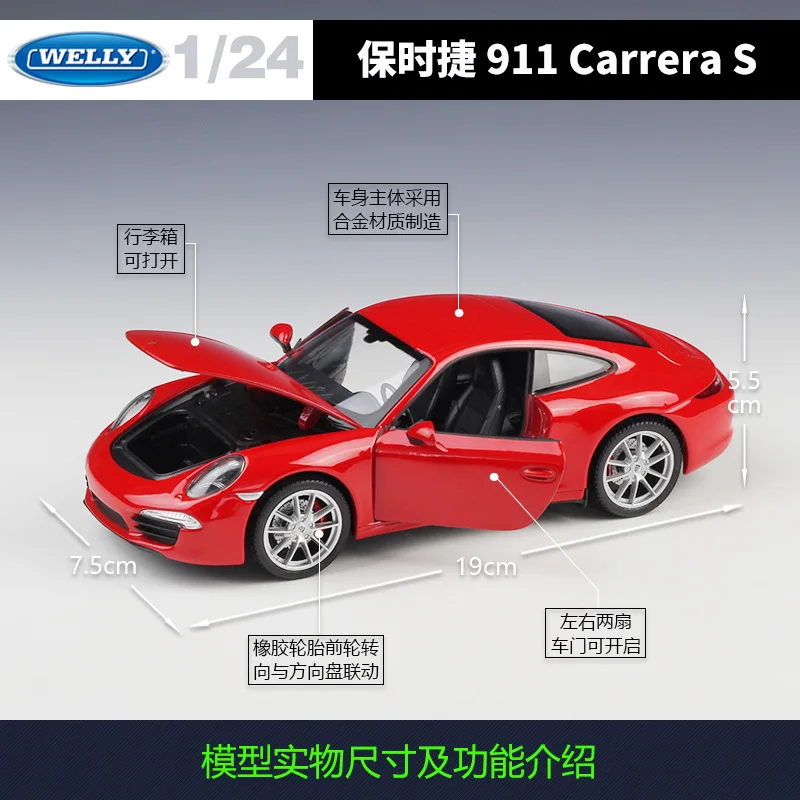 Experience the craftsmanship of this 1:24 scale diecast Porsche 911 Carrera S model, featuring a vibrant “911 Carrera S” metallic finish that captures its sleek, aerodynamic design. Crafted from durable metal, this highly detailed replica showcases the iconic oval headlights, integrated front air intakes, and a subtle rear spoiler that highlights its sporty elegance. The model includes realistic silver multi-spoke alloy wheels with textured tires, clear windows offering a glimpse of the black interior, and refined body lines that mirror the real car’s dynamic silhouette. Perfect for collectors and enthusiasts alike, this non-electric, adult-oriented item embodies sophistication and attention to detail.