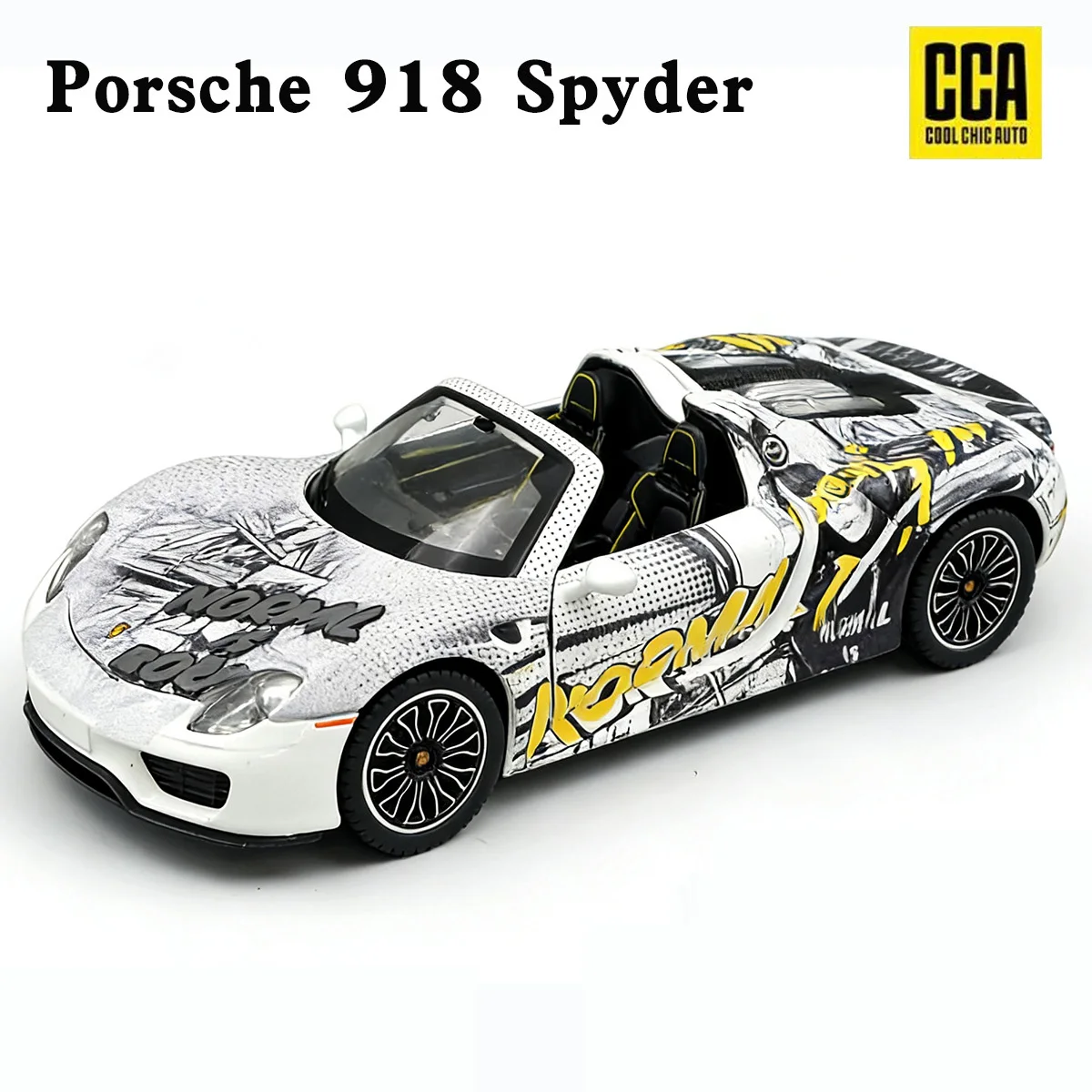 Experience the thrill of owning a stunning replica of the Porsche 918 Spyder in exquisite detail. Built from high-quality alloy and plastic, this 1:24 scale model captures the sleek, aerodynamic silhouette, glossy white finish, and dynamic contours of the original supercar. The realistic design features clear headlights, black grille accents, and multi-spoke textured wheels, creating an authentic and sporty appearance. Unique graphic decals with bold yellow and black elements add an artistic touch, making it a true collector’s item. With sound and light functions, as well as a pull-back mechanism, this model offers interactive play and display options. Perfect for car enthusiasts and collectors, it brings sophistication and excitement into any space with its meticulously crafted details.