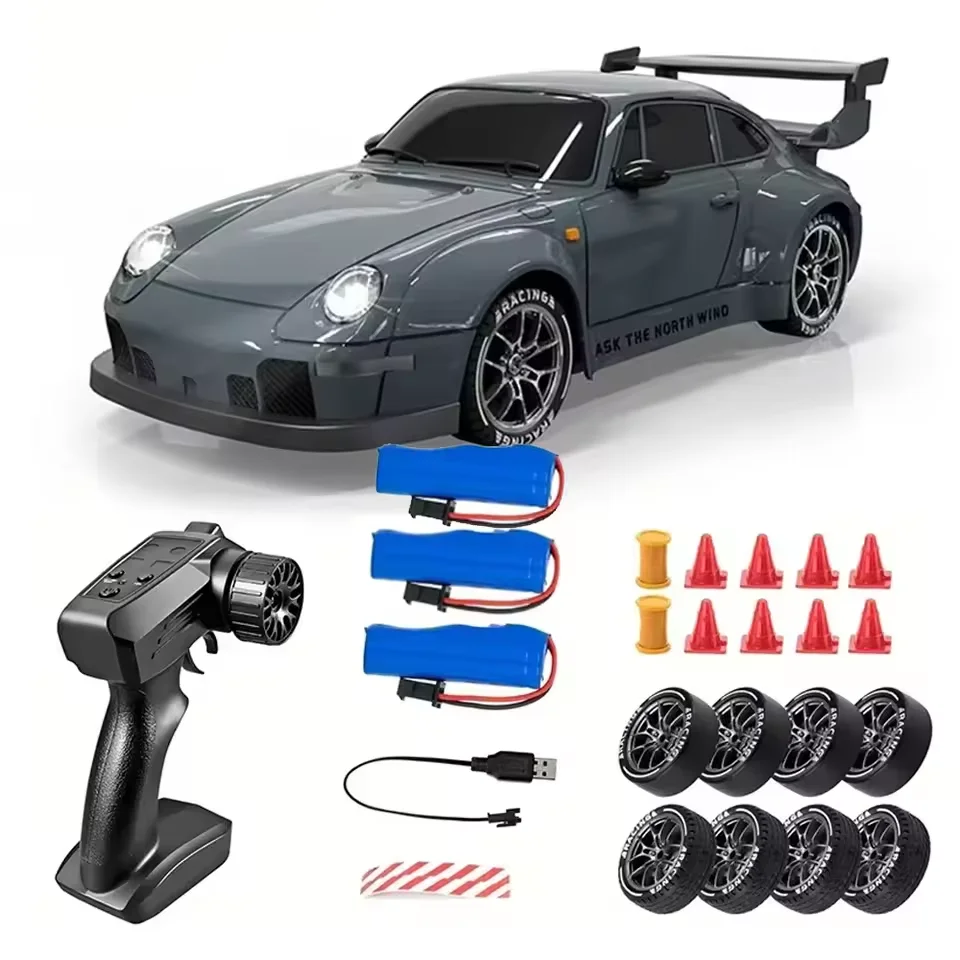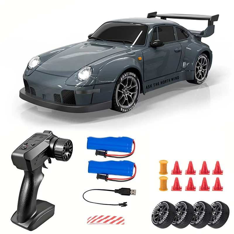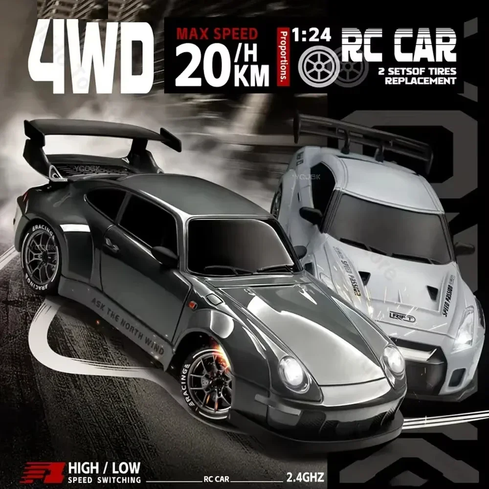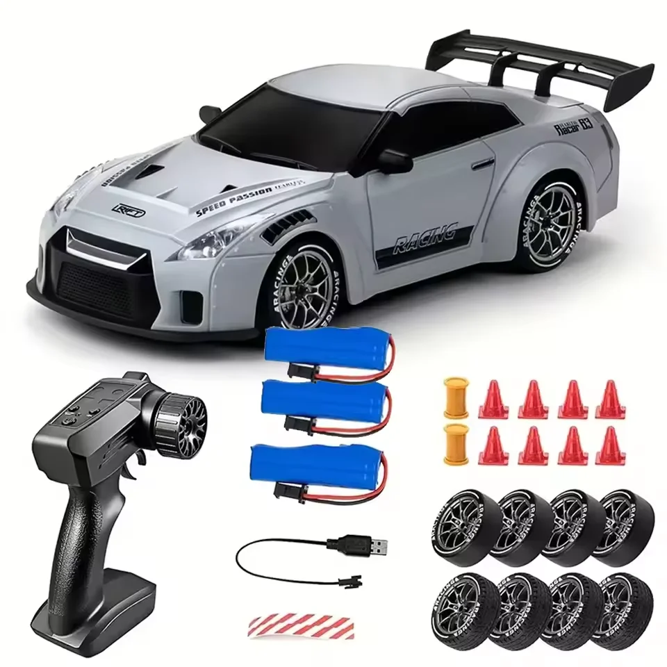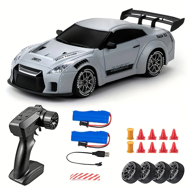 Experience the thrill of high-speed drifting with this meticulously crafted 1:24 scale RC drift car. Designed with a sleek, metallic silver finish, the aerodynamic body features bold curves, a low profile, and a shiny, reflective surface that captures attention instantly. Its realistic black tires with silver multi-spoke rims and flared wheel arches enhance the racing look. The prominent rear wing spoiler adds an aggressive, sporty touch, evoking the spirit of professional race cars. This mini marvel combines style and technical excellence, easily fitting into your hands while promising dynamic maneuverability. Whether you're indoors or outdoors, this vehicle delivers outstanding performance, making every drift session exciting and immersive. It’s perfect for collectors or anyone passionate about remote-controlled racing.