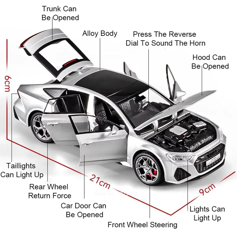 Discover the striking realism of this 1:24 scale RS7 diecast model, crafted with precision to replicate the signature sleek and sporty design of the original. Its glossy black, gray, or silver finish highlights the smooth, aerodynamic contours, sharp lines, and sculpted details. Measuring approximately 21 x 9 x 6 cm, this miniature vehicle features a durable zinc alloy body, rubber tires, and a plastic chassis, ensuring strength and authenticity. The model's six doors open smoothly, revealing a detailed interior. With built-in light and sound functions activated by buttons, plus a pull-back mechanism, this item offers a dynamic and engaging display. Perfect for collectors and enthusiasts seeking a realistic, high-end replica.