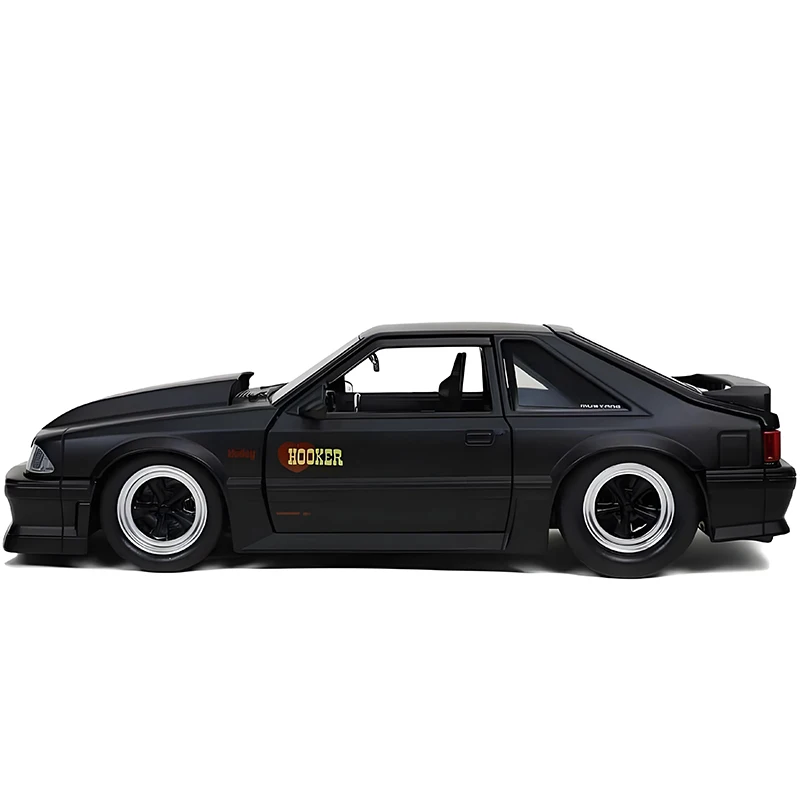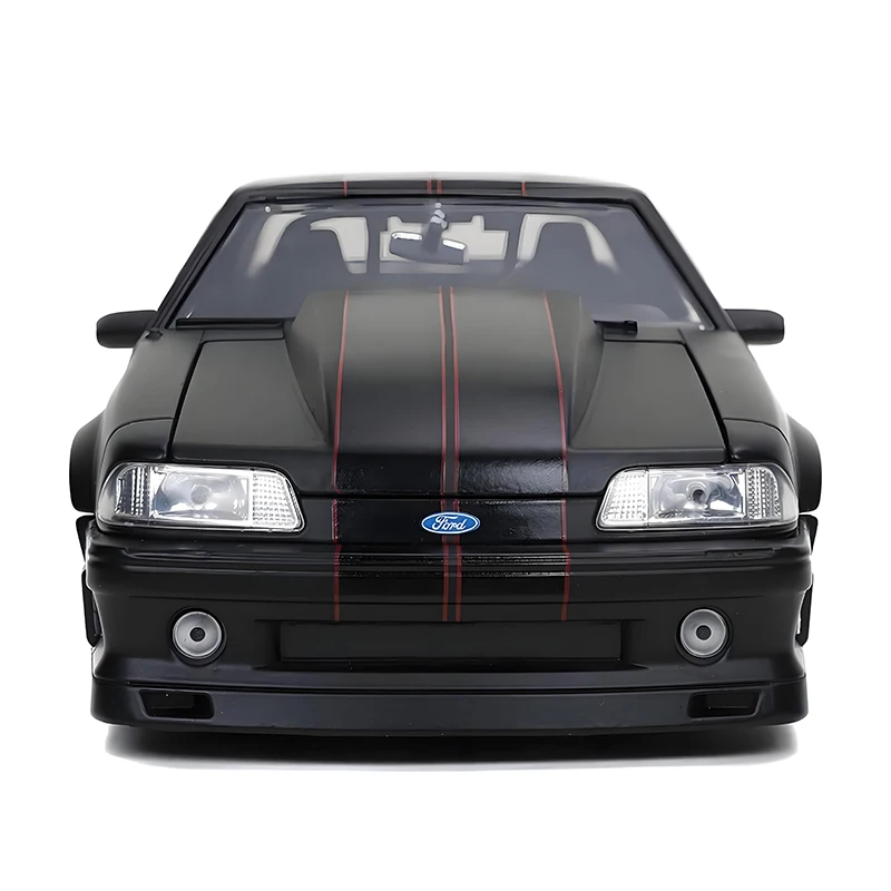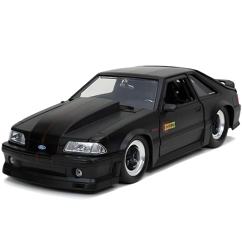 This 1:24 scale diecast model of the iconic 1989 Ford Mustang GT features a sleek matte black finish, with detailed design elements such as a prominent hood bulge, sharp headlights, and an integrated rear spoiler. Crafted from alloy and plastic, it showcases realistic alloy rims with a black center and polished silver lip, complemented by rubber tires. The body includes subtle accents like black door handles, widened wheel arches, and side skirts, capturing the muscle and sporty stance of the original vehicle. Available in red silver, black, blue, and blue silver, this collectible miniature is perfect for display, offering authentic detailing for enthusiasts and collectors alike.