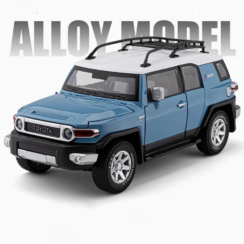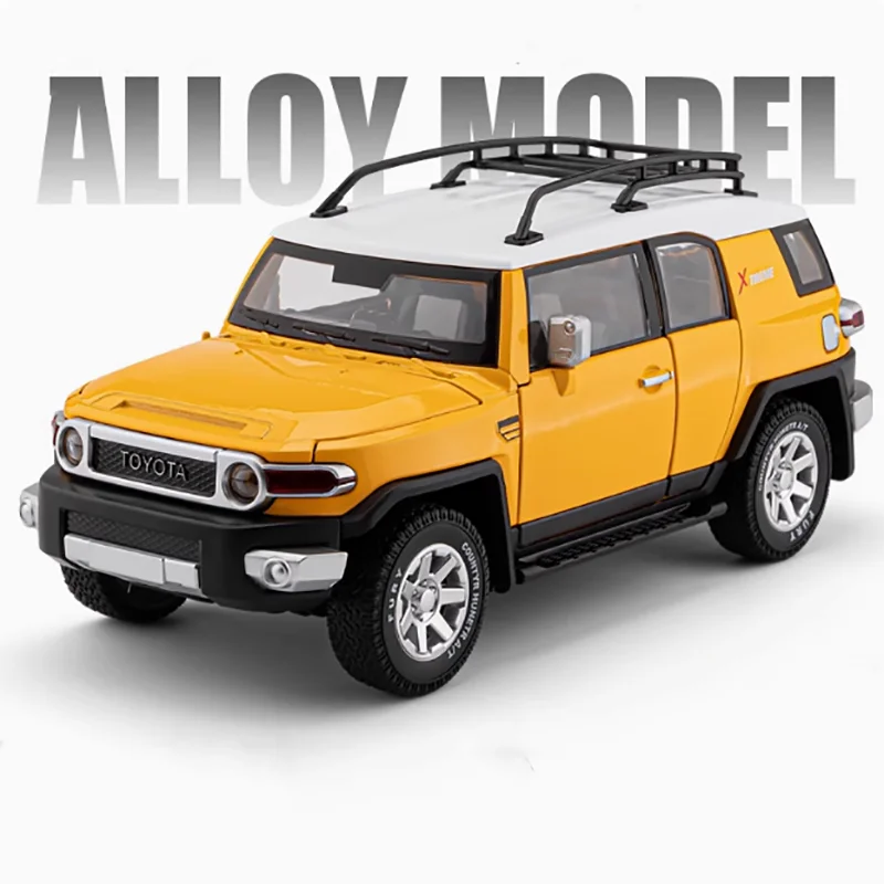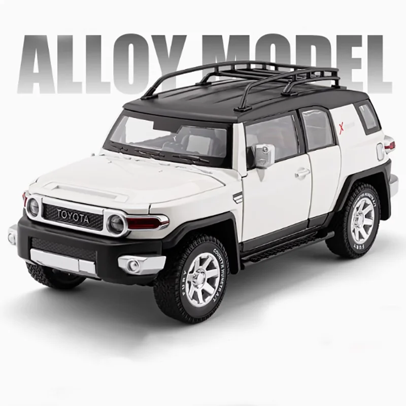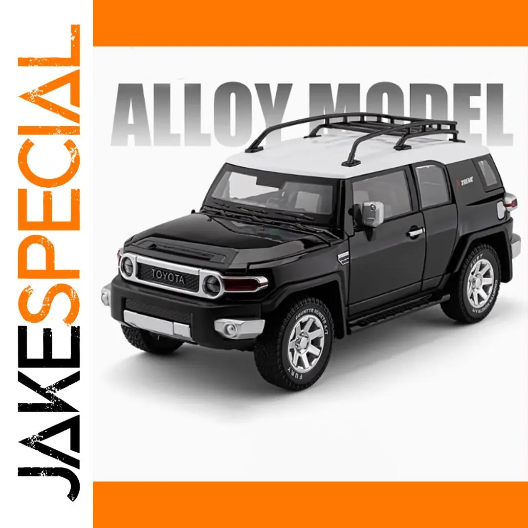 This 1:24 scale alloy model of an off-road cruiser vehicle features a rugged, boxy design emphasized by a matte black body with a contrasting white roof, creating a striking two-tone appearance. Measuring approximately 21.5 cm in length, 9 cm in width, and 9.7 cm in height, this detailed model showcases realistic elements such as silver alloy rims, treaded rubber tires, a prominent front grille, circular headlights, and roof rails for an adventurous look. Crafted from durable metal, it’s perfect for collectors and display enthusiasts, offering a rugged aesthetic that captures the spirit of off-road exploration. Please note, it is a fragile, static model intended solely for decoration.