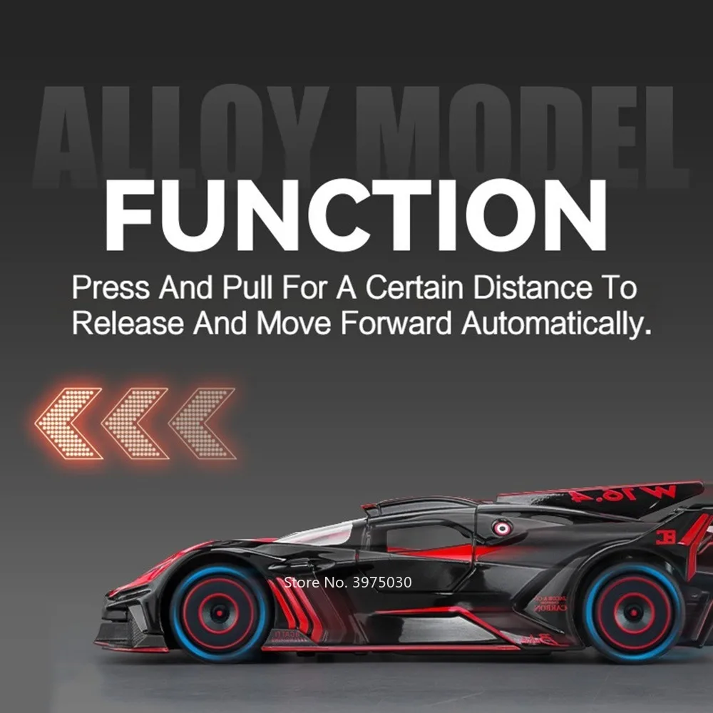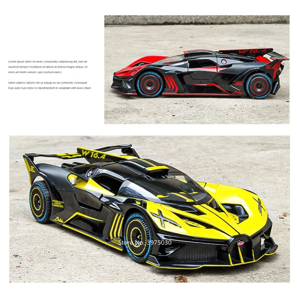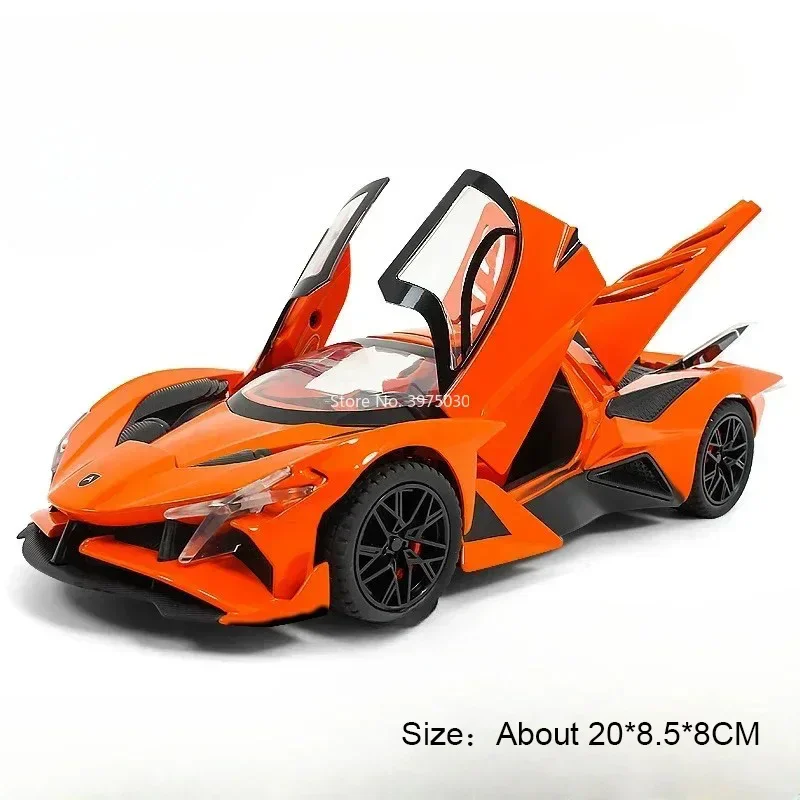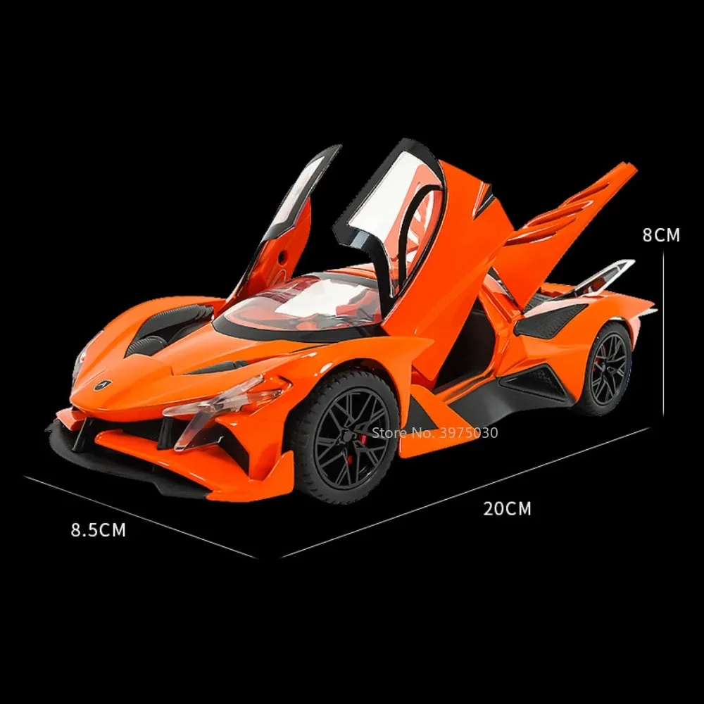 Imagine owning this meticulously crafted 1:24 scale alloy car model, perfect for collectors and racing enthusiasts alike. Designed with striking attention to detail, this model combines a zinc metal body with a plastic chassis and rubber tires, ensuring durability and authenticity. The sleek, aerodynamic shape, featuring a prominent rear wing and angular contours, perfectly captures the essence of high-performance racing vehicles. Available in vibrant colors like Apollo EVO Black, Orange, Red, and Bolide Blue, Red, Yellow, it promises to stand out in any collection. With functional opening doors, sound, and light effects, plus a pull-back mechanism, it delivers an engaging experience. This model truly embodies speed, precision, and style.
