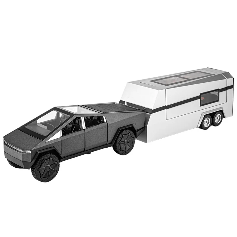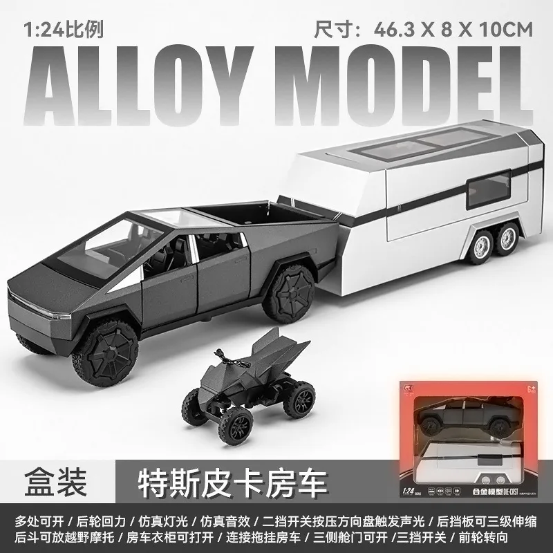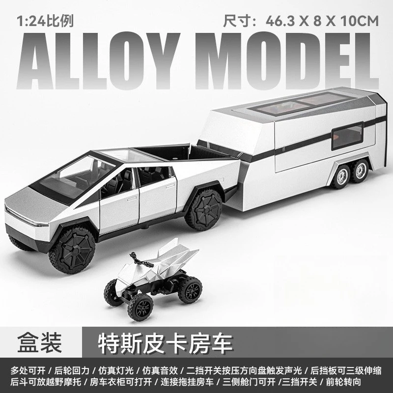 - This 1:24 scale alloy model features three distinct vehicles: a silver pickup, a matching trailer RV, and a small white off-road buggy, all designed with modern, angular, and geometrical aesthetics.