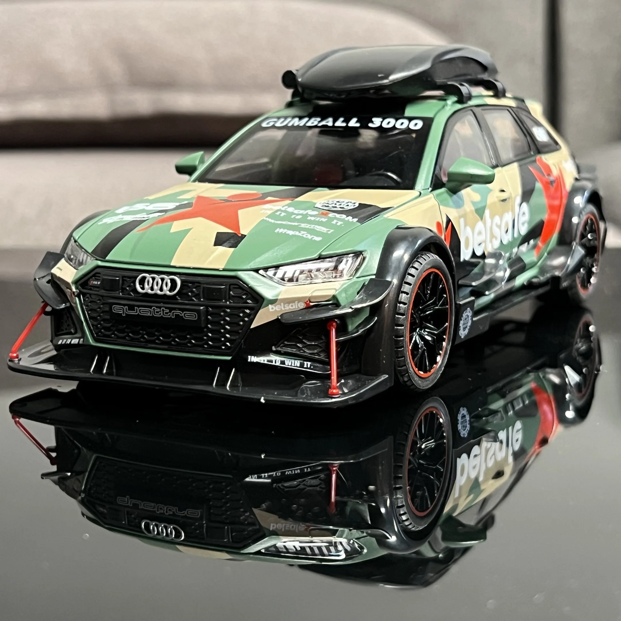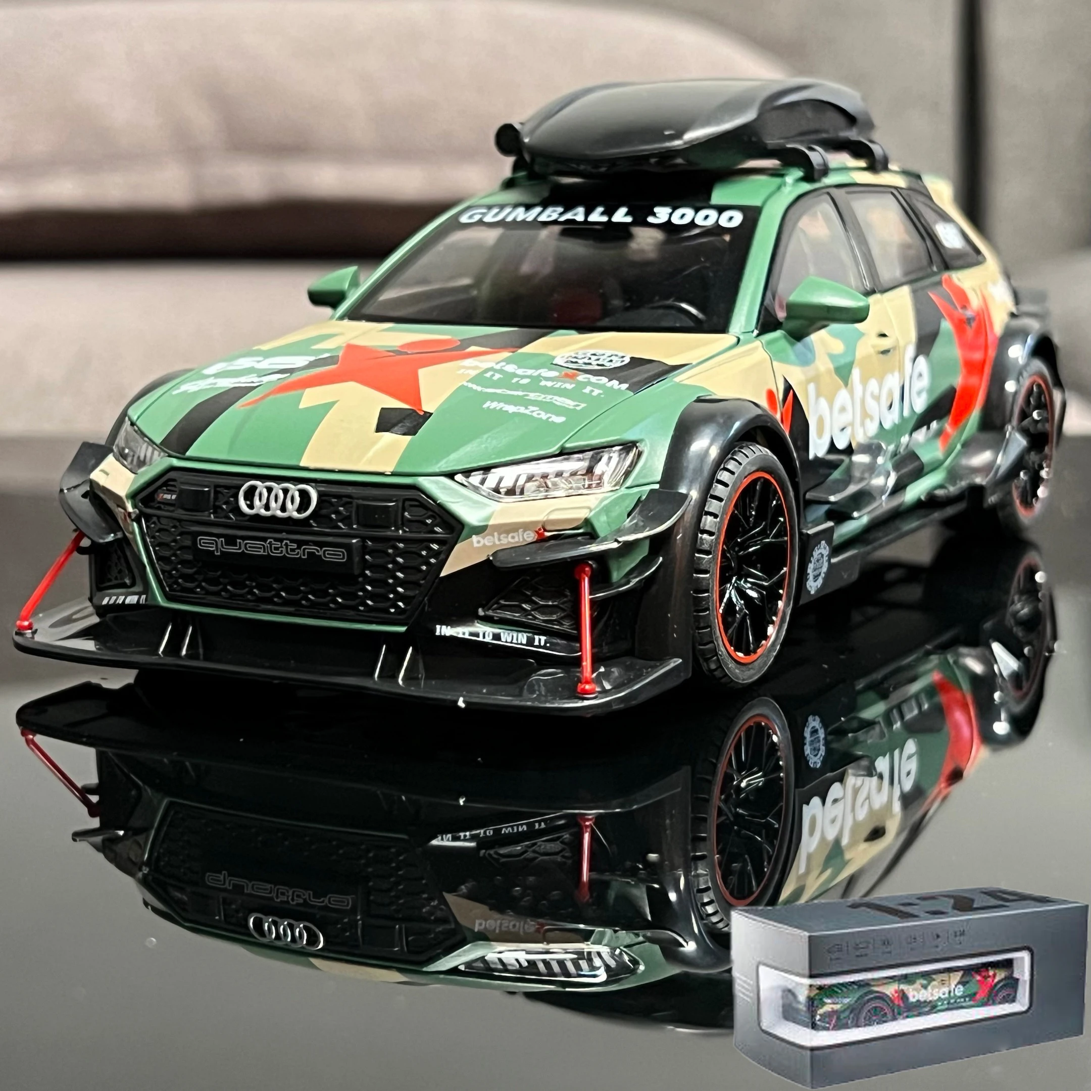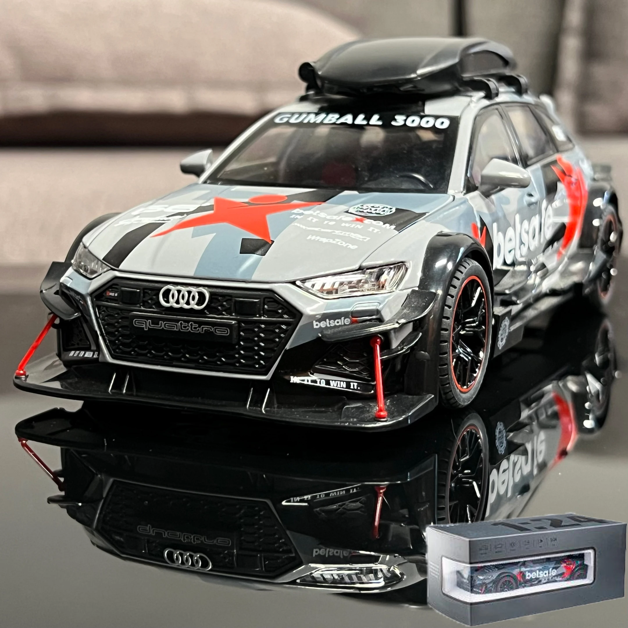This meticulously crafted 1:24 scale model of the modified Audi RS6 Wagon is a stunning representation of automotive design. The model captures the essence of the original vehicle with a matte black finish highlighted by striking blue, red, and white accents. Racing decals such as “GUMBALL 3000” on the windshield add character, complemented by sleek aerodynamic features like a front splitter. The inclusion of sound and light functions enhances its appeal, while the expertly detailed wheels and racing-style interior provide an authentic touch for collectors and enthusiasts alike.