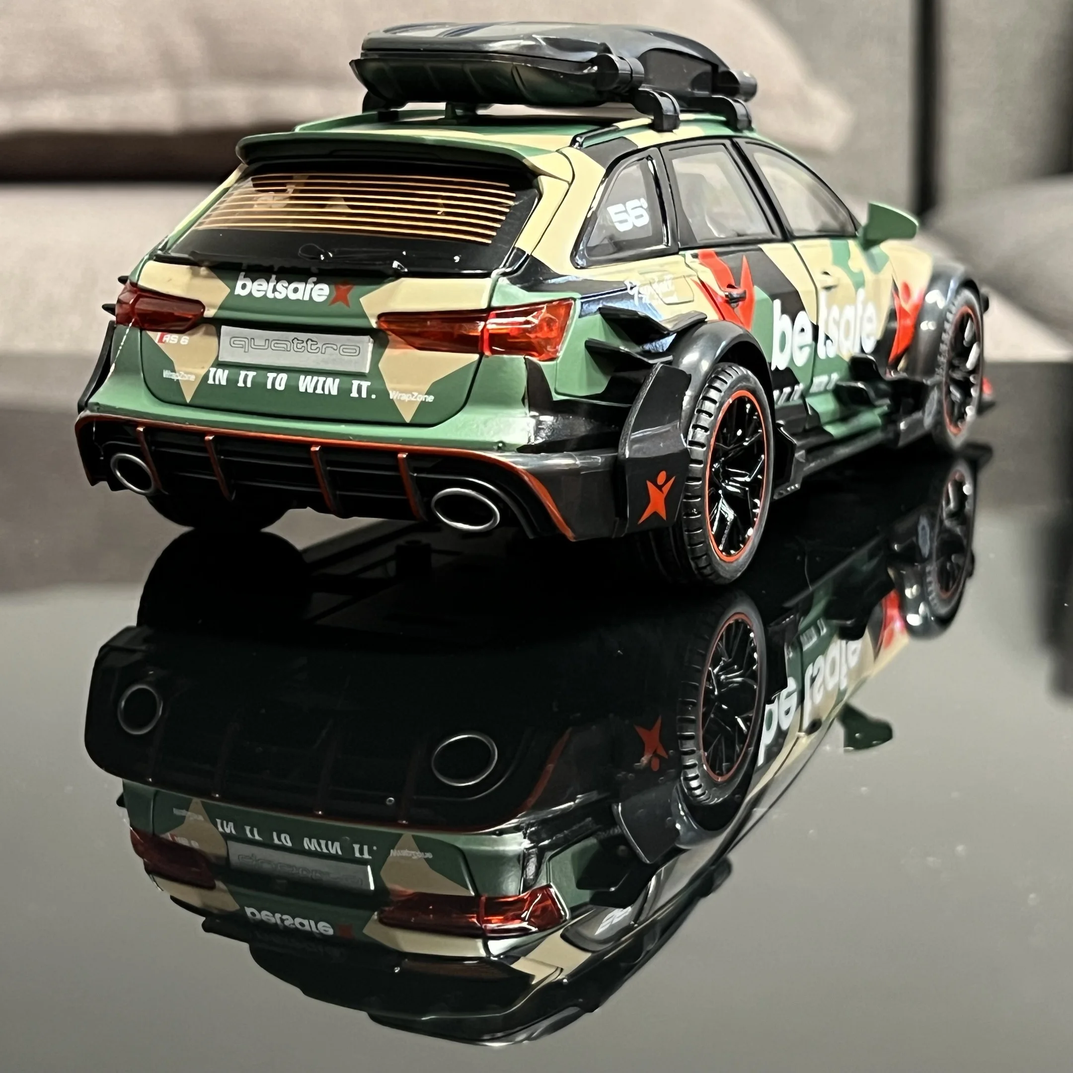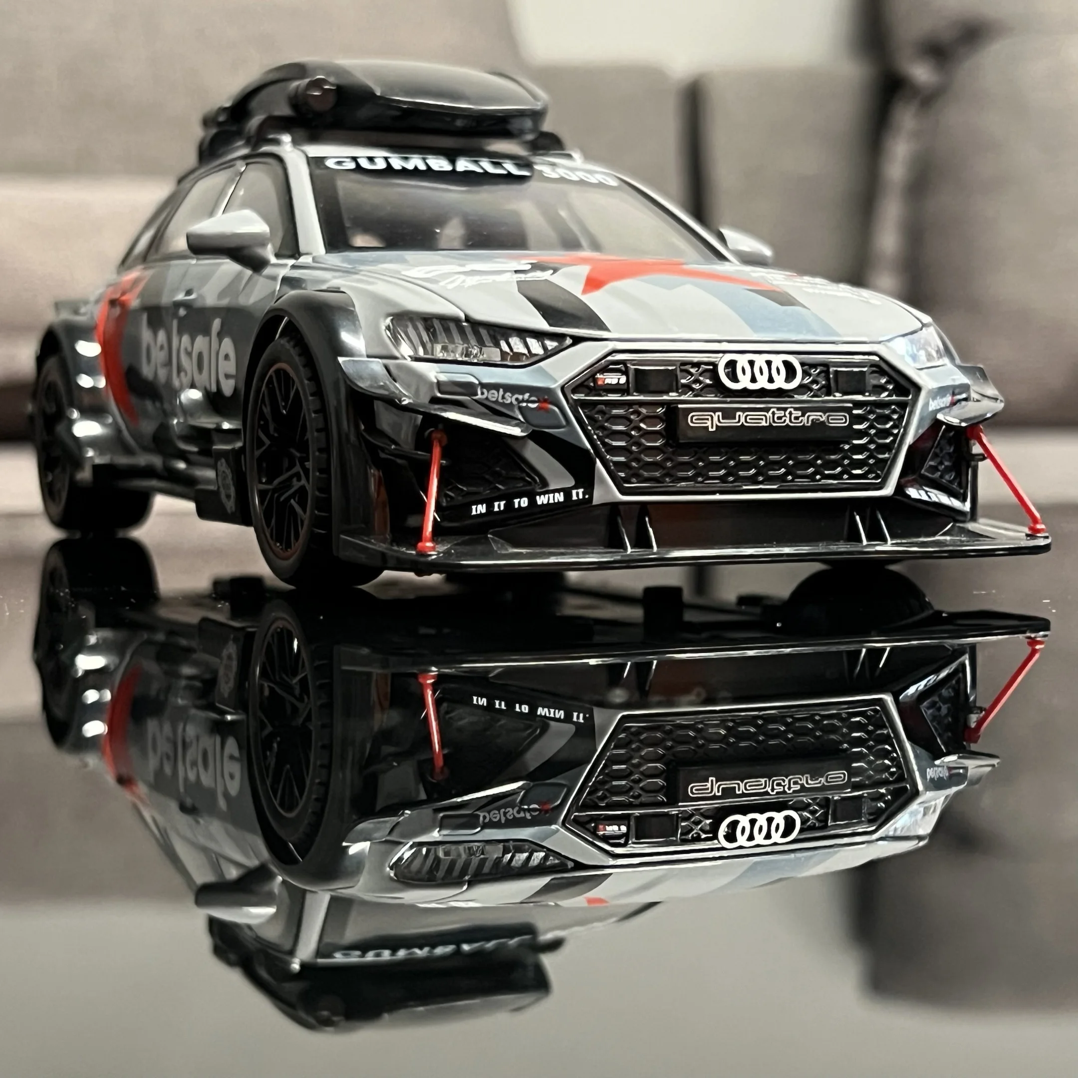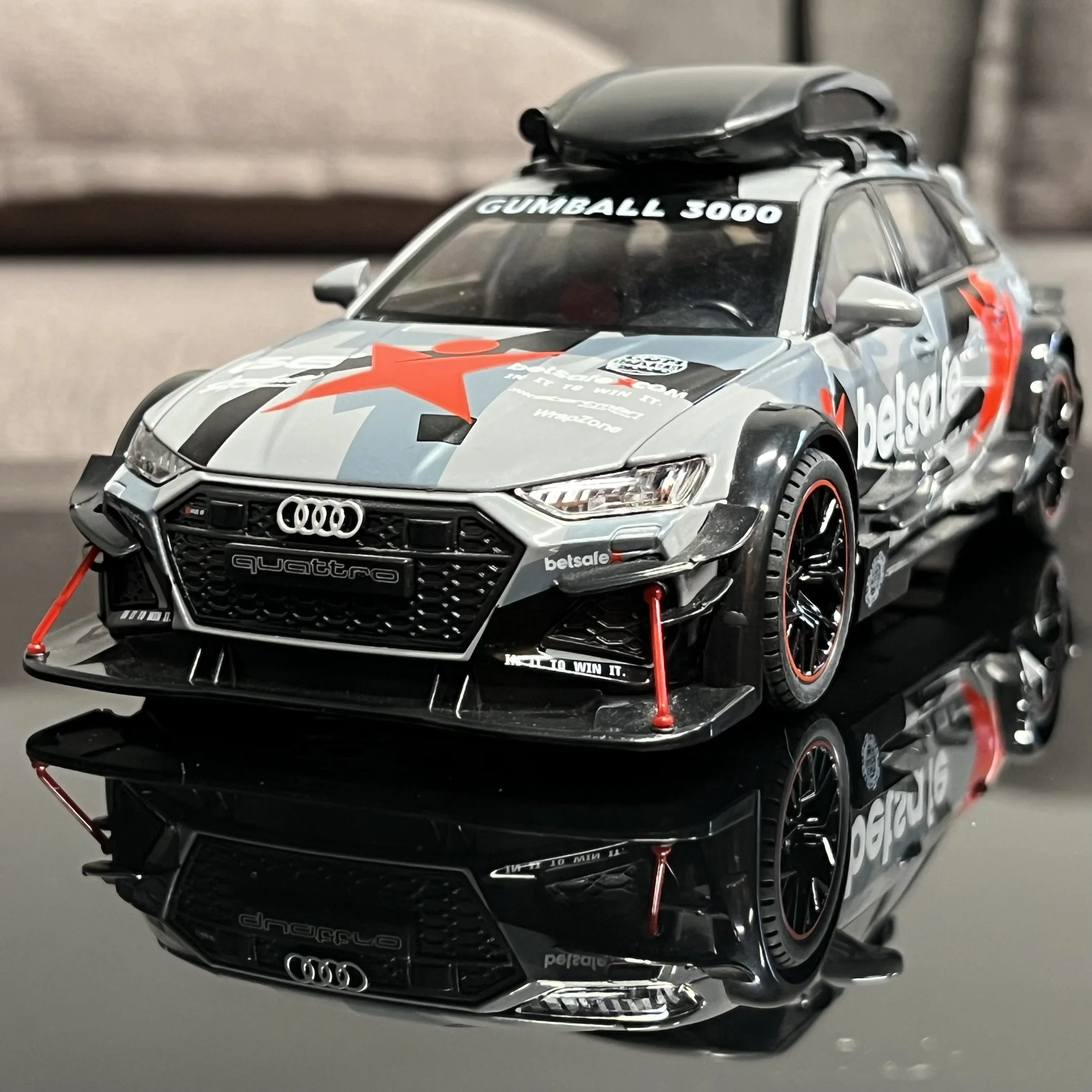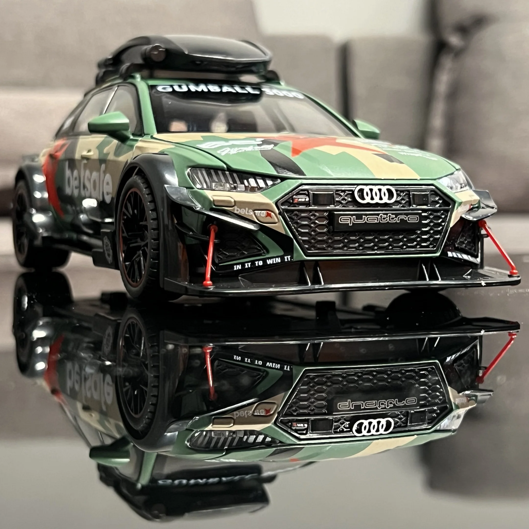This meticulously crafted 1:24 scale model of the modified Audi RS6 Wagon is a stunning representation of automotive design. The model captures the essence of the original vehicle with a matte black finish highlighted by striking blue, red, and white accents. Racing decals such as “GUMBALL 3000” on the windshield add character, complemented by sleek aerodynamic features like a front splitter. The inclusion of sound and light functions enhances its appeal, while the expertly detailed wheels and racing-style interior provide an authentic touch for collectors and enthusiasts alike.