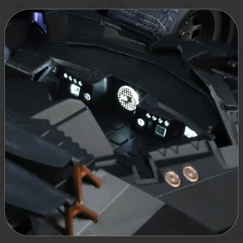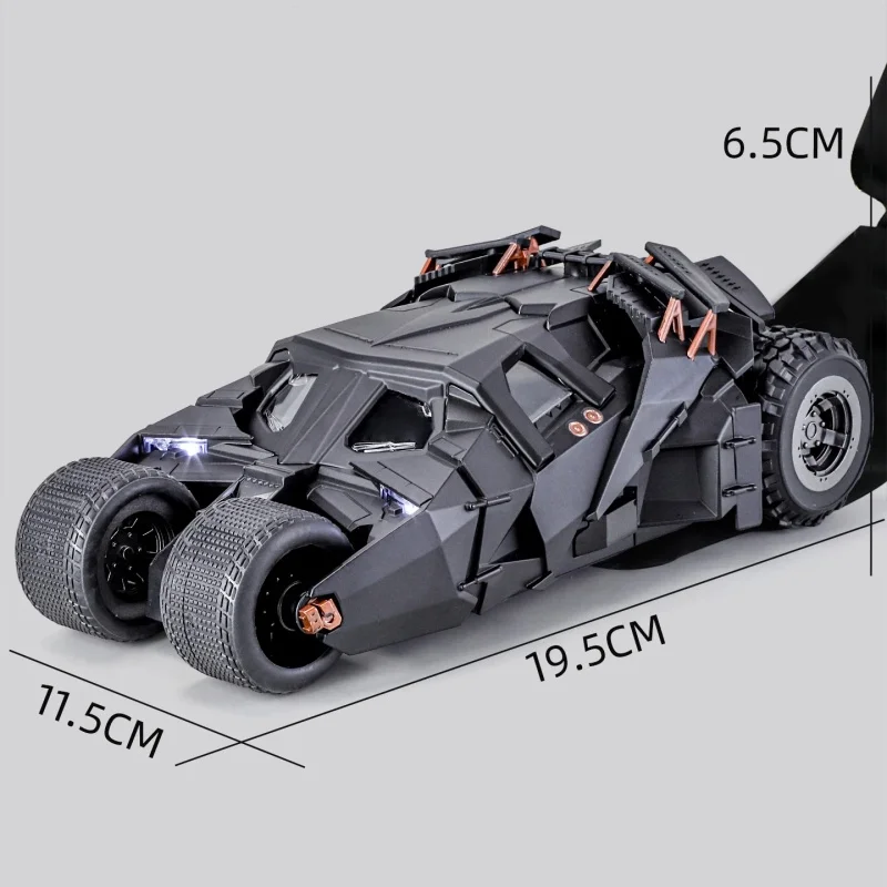 Experience the thrill of owning this highly detailed 1:24 scale Batmobile Tumbler, inspired by the iconic Batman universe. Crafted from diecast alloy and plastic, this model captures the rugged, armored look of the legendary vehicle. Its sleek, black finish enhances its futuristic, angular design, featuring sharp edges, geometric panels, and intricate surface details like vents and panel lines. The headlights emit a bright white LED glow, adding realism and impact. Equipped with sound and light functions, this collectible enthusiast’s piece offers an immersive display. Its impressive low-slung profile and wide stance make it a commanding addition to any collection, perfect for display and admiration.