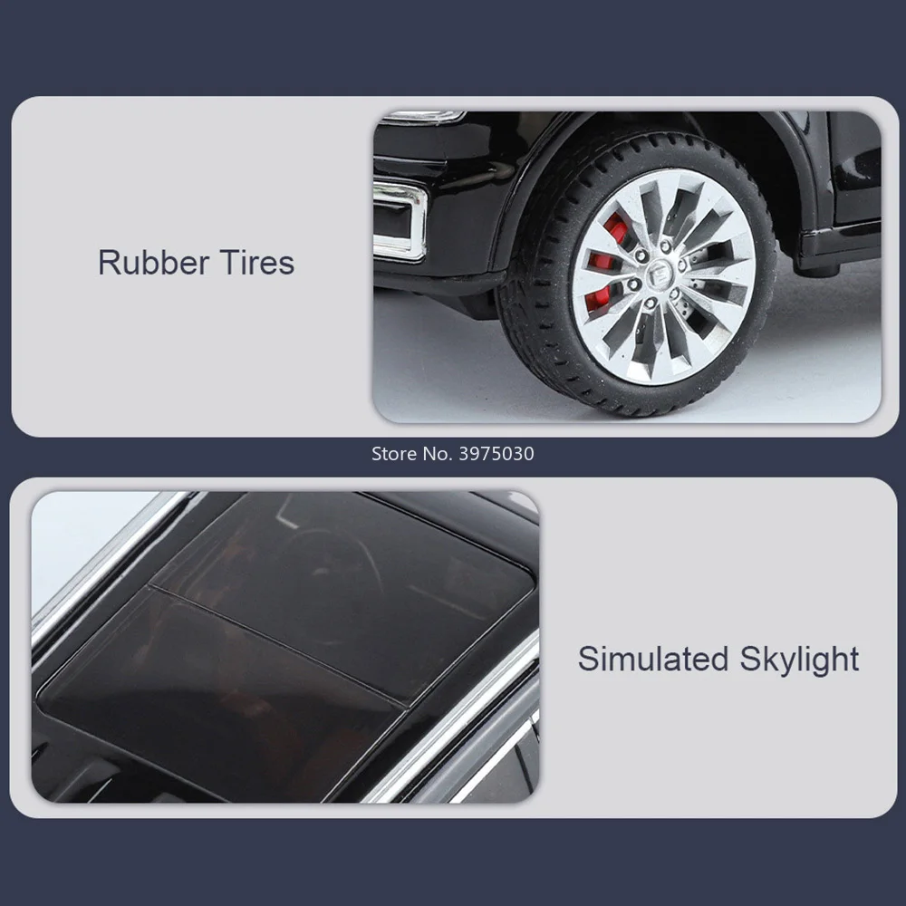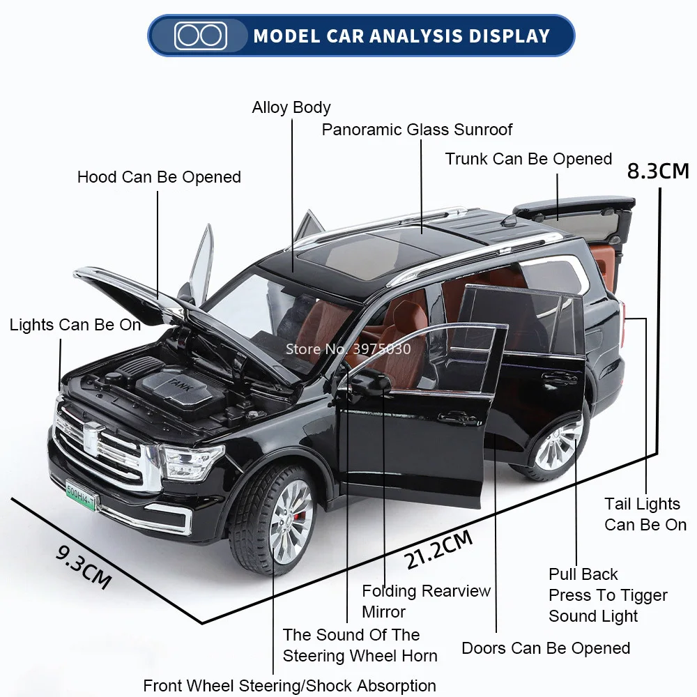 Experience the thrill of owning a high-quality miniature SUV that combines realism with engaging features. This detailed 1:24 scale model is crafted using zinc metal for a sturdy body, complemented by a durable plastic chassis and textured rubber tires that mimic off-road tread patterns. Its sleek, glossy black finish reflects light beautifully, highlighting its modern and carefully designed aesthetic. The model includes six opening doors, allowing you to explore the intricacies of its detailed interior and exterior. With built-in sound and light features, it brings your collection to life, making it perfect for display or imaginative play. Ready to elevate your automotive collection or surprise a fellow enthusiast, this model offers both style and functionality.