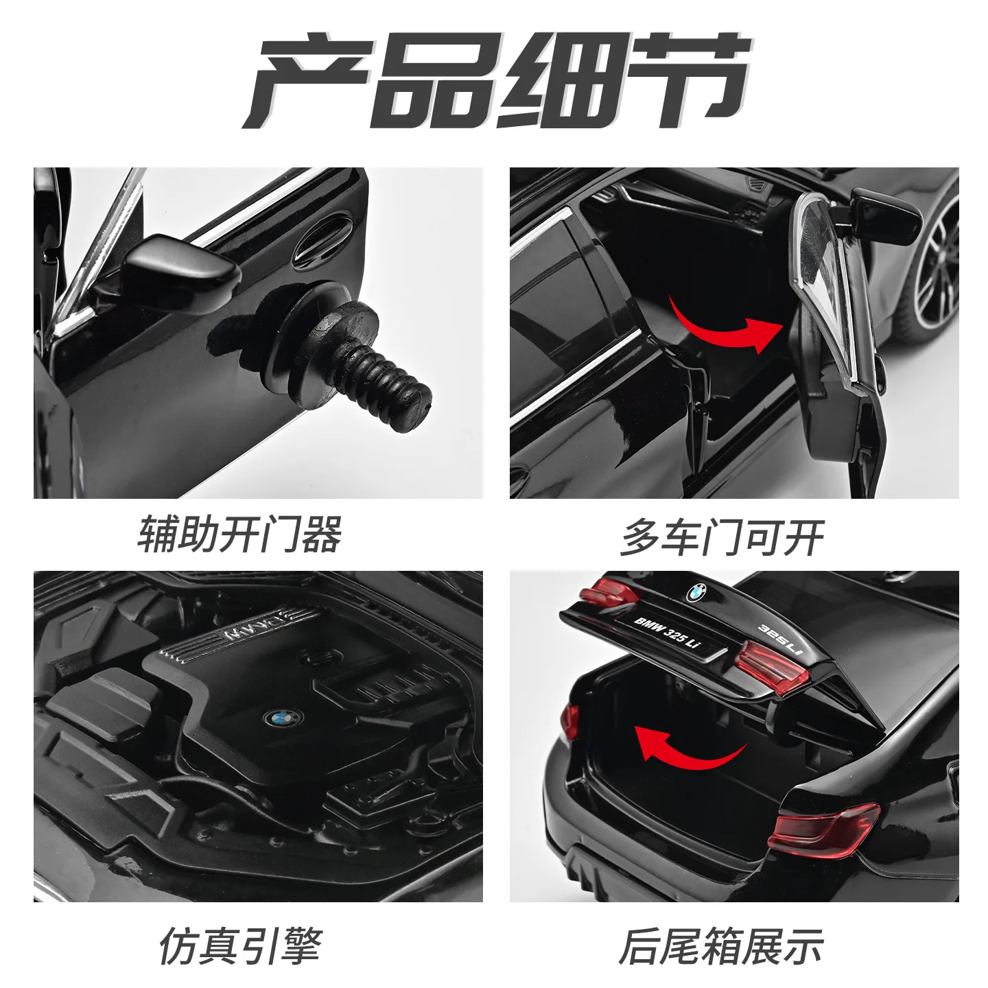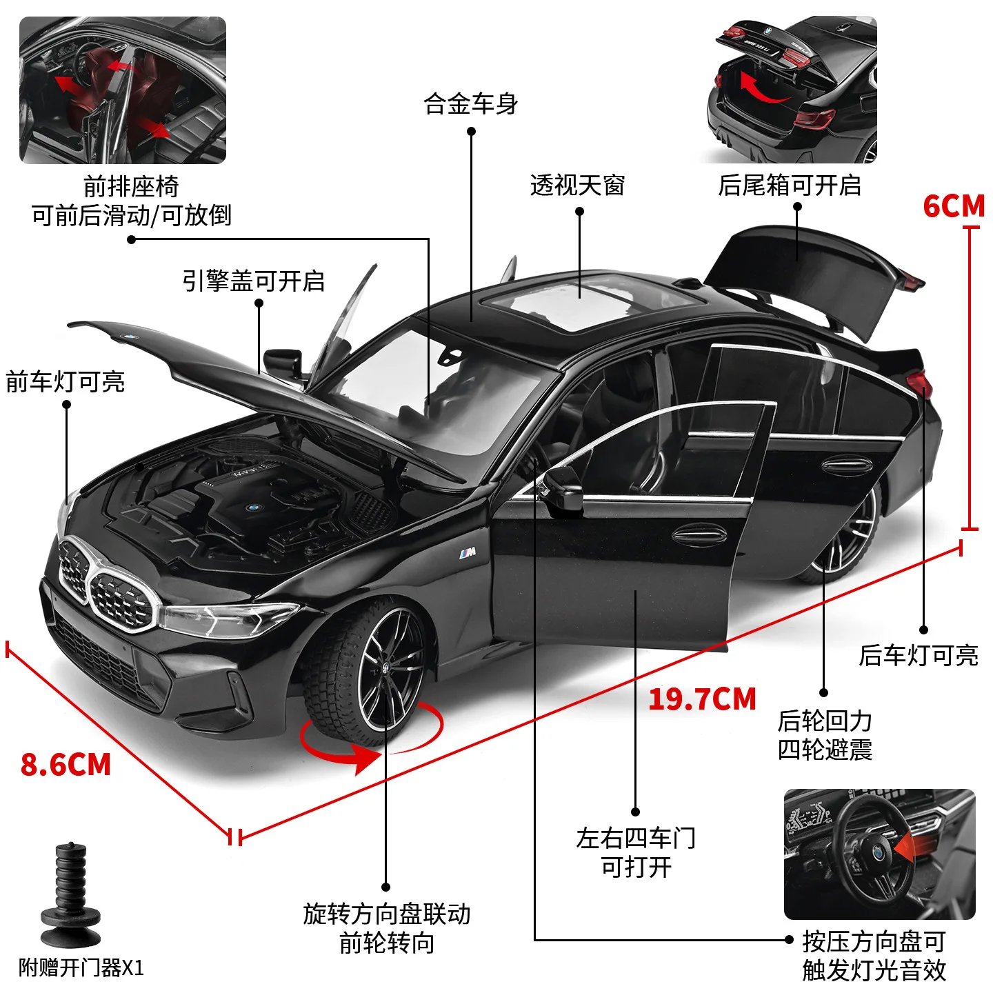 - Crafted from high-quality metal with a polished metallic finish emphasizes durability and realistic appearance. The sleek body lines and aerodynamic shape recreate the modern BMW aesthetic tightly.
