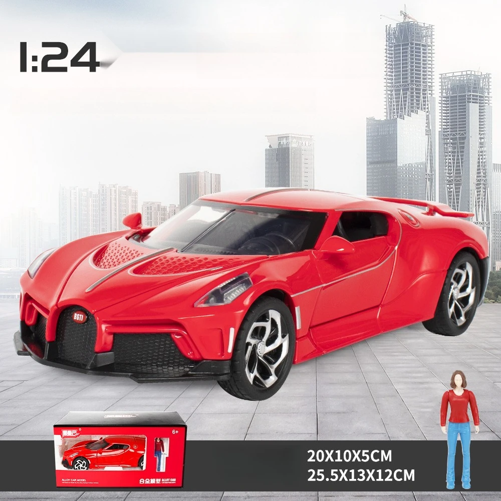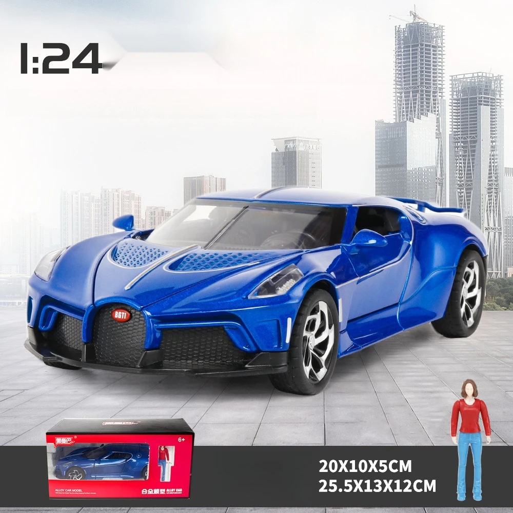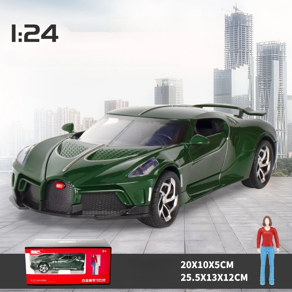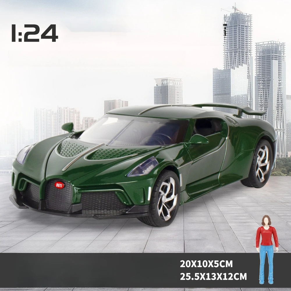 This meticulously crafted diecast model captures the essence of the luxurious Bugatti La Voiture Noire. Measuring at a 1:24 scale, it boasts a realistic, high-simulation design with a sleek, aerodynamic body finished in glossy black that exudes modern sophistication. The detailed exterior features intricate multi-spoke rims, textured tires, and tiny side mirrors, emphasizing craftsmanship. Bright white LED headlights and vivid red taillights add a high-tech, dynamic contrast, accentuating its sporty elegance. The model’s hood displays subtle contours, while the rear showcases a distinctive diffuser with multiple exhaust pipes. Built from durable metal, this non-electric collectible combines trendy aesthetics with exceptional detail, making it perfect as an ornament or toy for enthusiasts aged 14 and above.