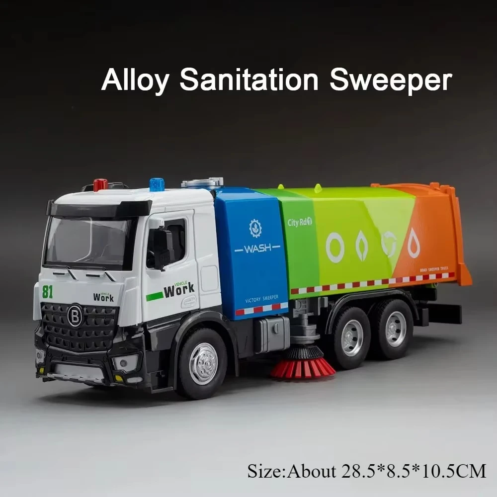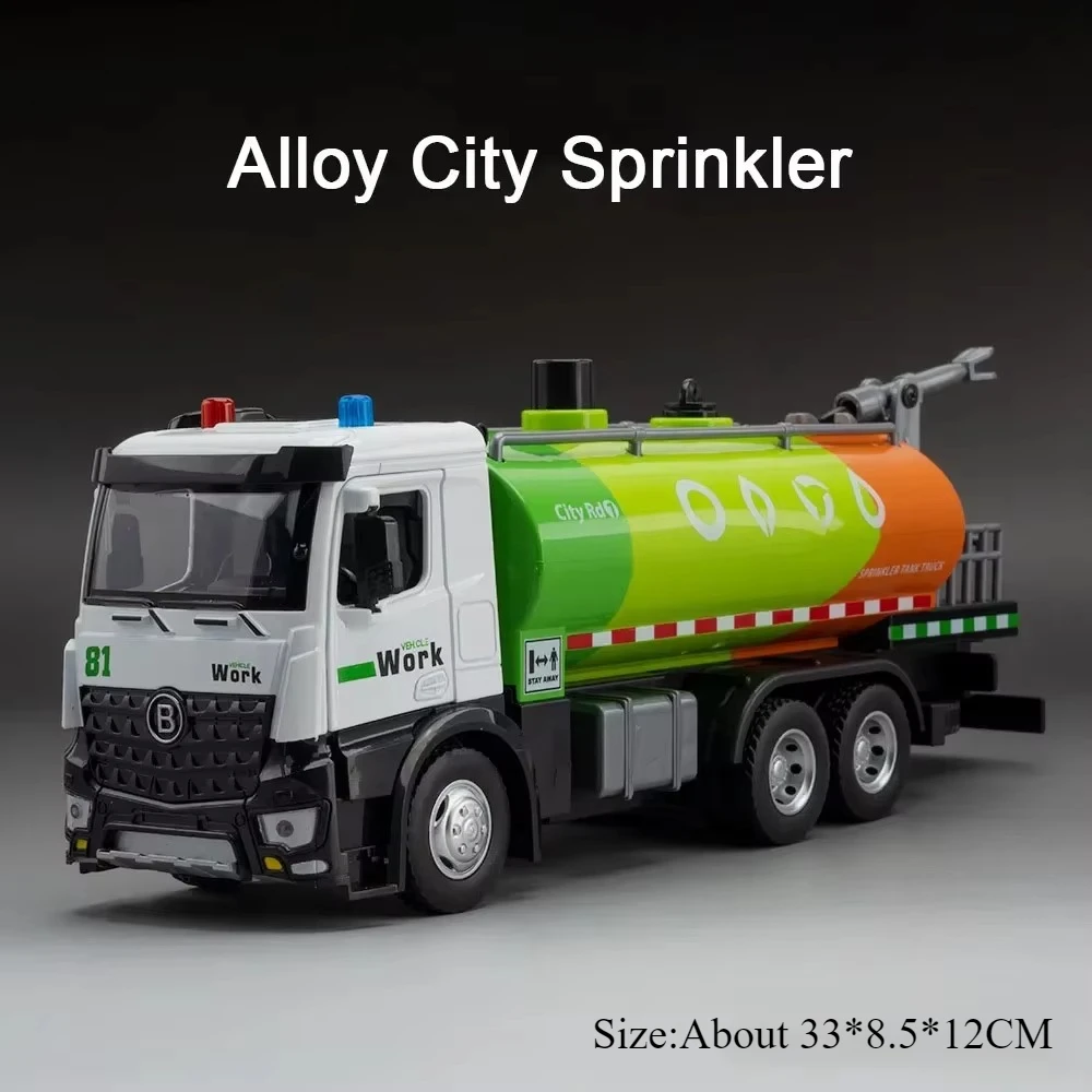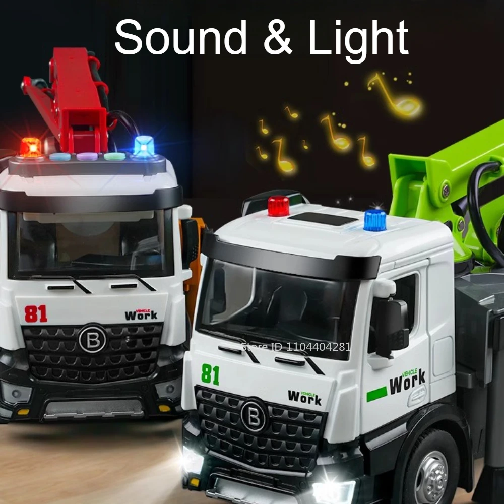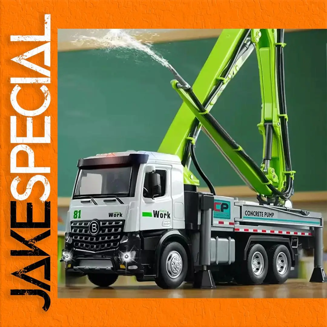 Imagine owning this detailed miniature of a heavy-duty cement pump truck, capturing every intricate detail with a sleek white and black finish. Perfect for collectors or enthusiasts, this model features a vibrant lime green articulated pump arm with hydraulic pistons and segments that suggest realistic movement. The cab's clear windshield and side windows, complemented by functioning opening doors, add to its lifelike appearance. The headlights are illuminated, creating a dynamic effect, while printed labels and hydraulic lines enhance authenticity. Constructed from durable alloy with plastic chassis and rubber tires, this model combines aesthetic appeal with resilience, making it an eye-catching addition to any display or collection. Feel confident adding this unique vehicle to your collection today.