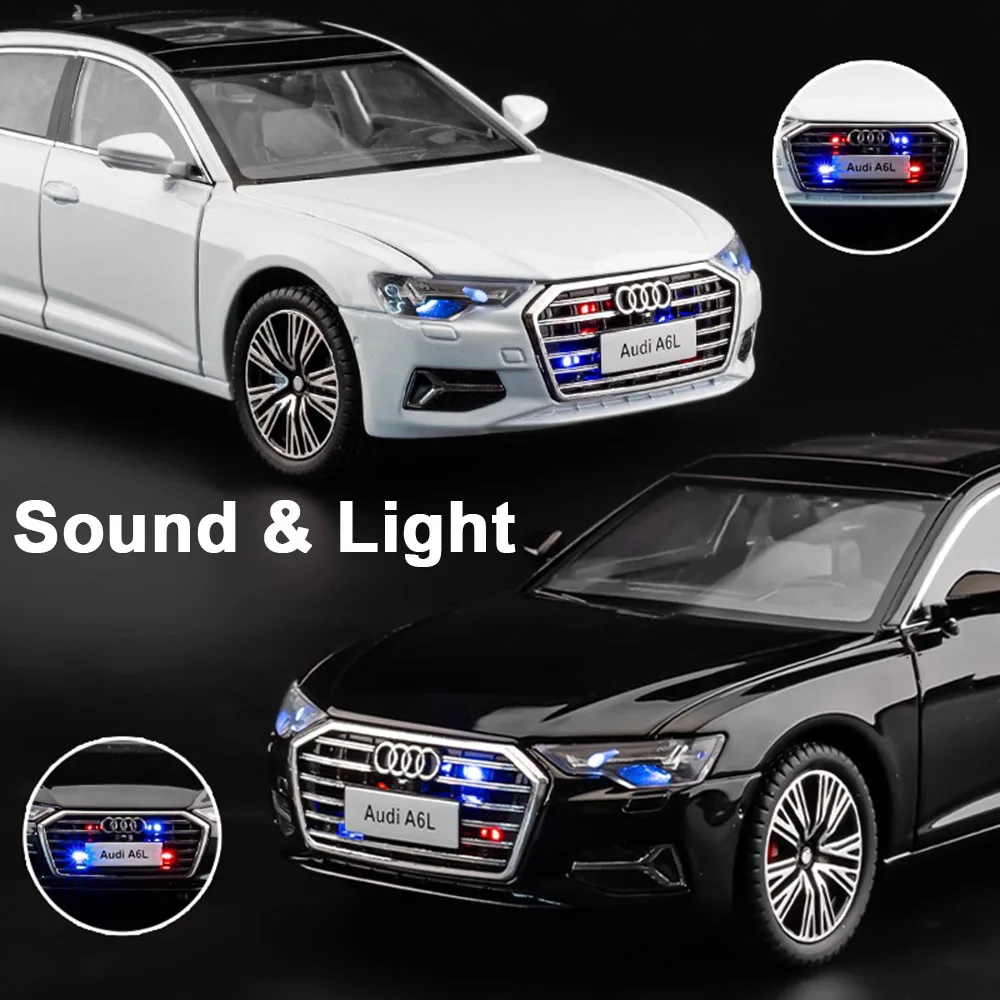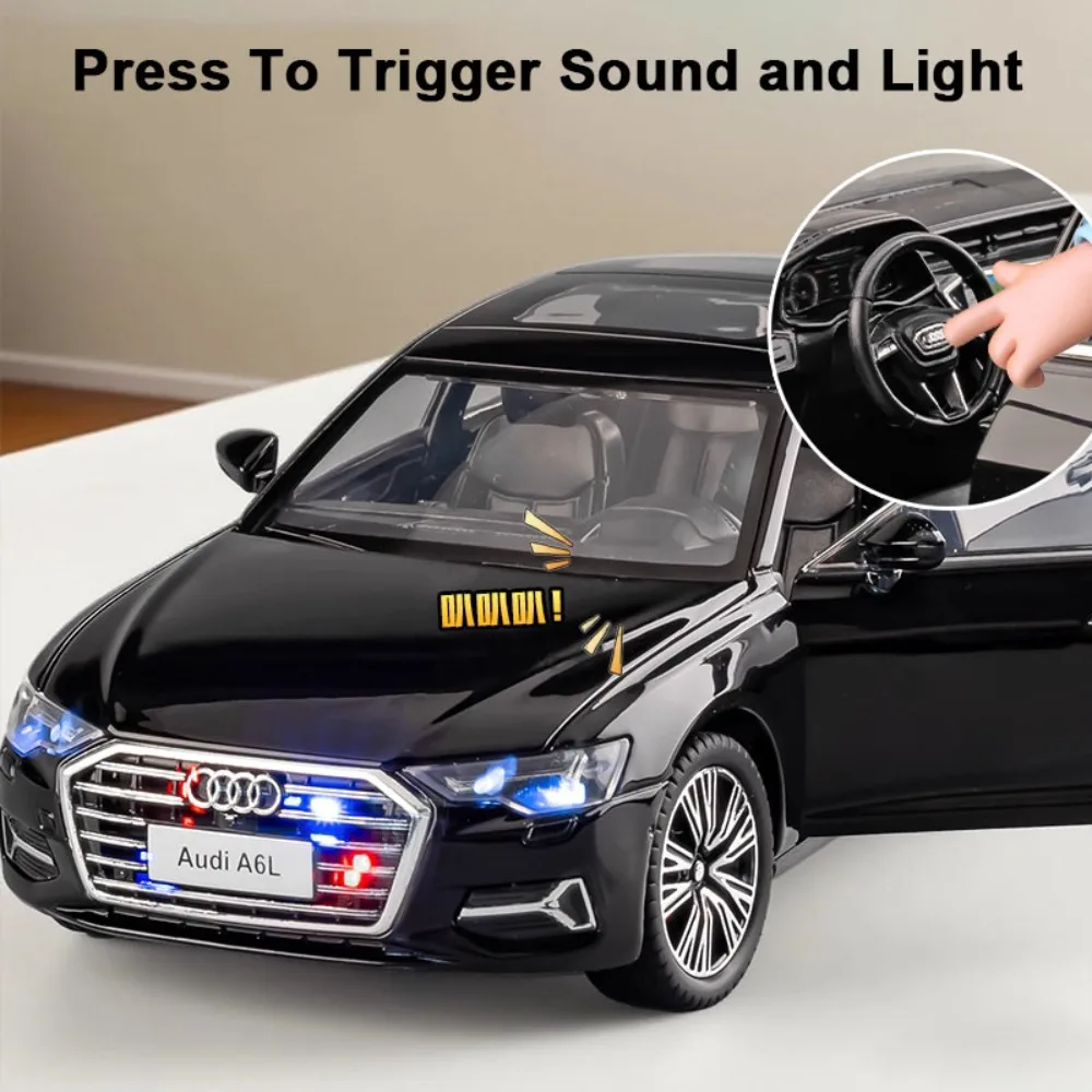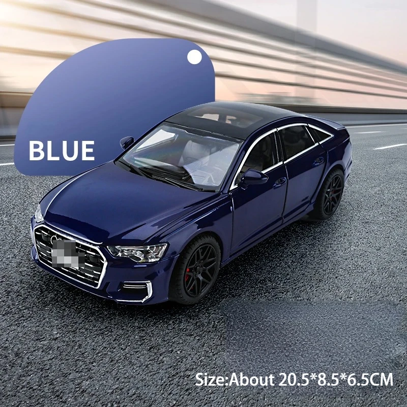 Discover the elegance of this highly detailed 1:24 scale diecast alloy car model, perfectly crafted to resemble a luxury A6L sedan. With its sleek, glossy black finish, it exudes sophistication and realism, making it a perfect addition to your collection or display space. The model boasts intricate exterior details, including a finely designed front grille with horizontal slats and bright blue LED-lit accents, sharp LED headlights, and smooth, precisely contoured body lines that mimic a full-sized vehicle. Its movable front wheels, opening doors, and functional pull-back, sound, and light features make it interactive and engaging. This model offers a premium look and feel, enhancing any automotive or collector’s display with its high simulation quality and durable construction.