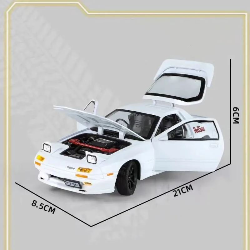 Experience the thrill of owning this beautifully crafted 1:24 scale diecast Mazda RX-7 from the iconic Initial D series. Made from high-quality alloy and plastic, this model captures the sleek, aerodynamic design of the original sports car with flowing curves and sharp lines that evoke speed and agility. Its predominantly white finish is accentuated with black details on the wheels and trims, creating a modern sporty aesthetic. The dual pop-up headlights feature clear lenses and fine black detailing, while the rear showcases a subtle lip spoiler and segmented taillights for added visual interest. Perfect for display, collection, or as a gift, it promises to transport you to the world of racing and automotive excellence.