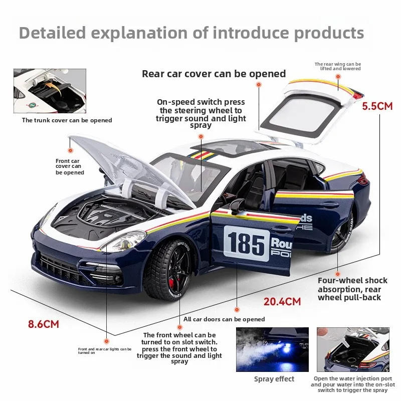 Experience the thrill of owning this highly detailed miniature Porsche Panamera supercar. Crafted with precision, it features a sleek white body with bold racing stripes in yellow, red, and black, creating a dynamic and sporty look. The aerodynamic design and sculpted lines mimic real racing cars, while realistic headlights, grille, and detailed air intakes add authenticity. Transparent windows reveal meticulously crafted interior details, and the black wheels with red brake calipers and textured tires enhance its performance-inspired aesthetic. Additional features like an liftable rear wing, openable doors, and functional side mirrors make this model not only a perfect display piece but also an interactive collectible. It’s a striking tribute to speed and style for all car enthusiasts.