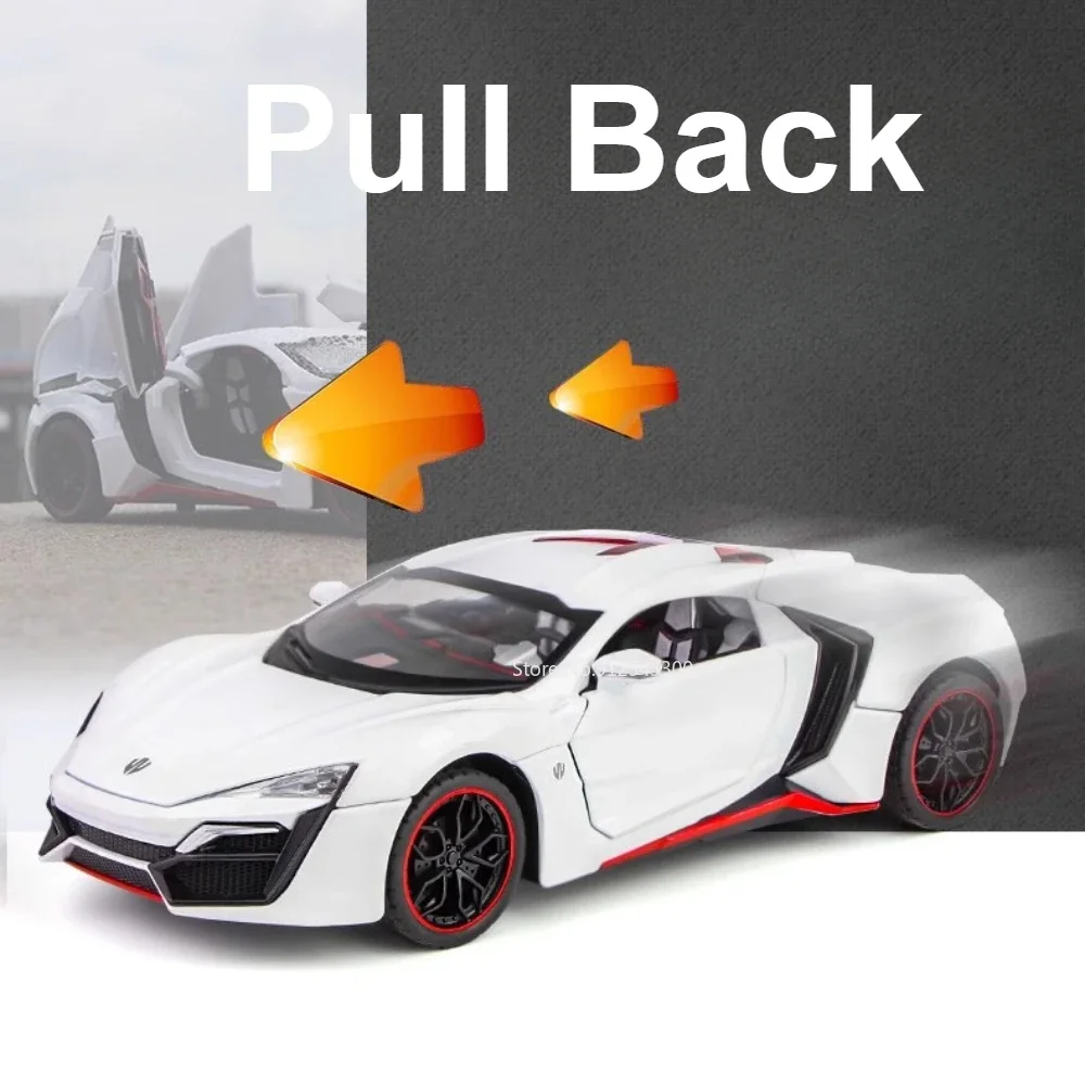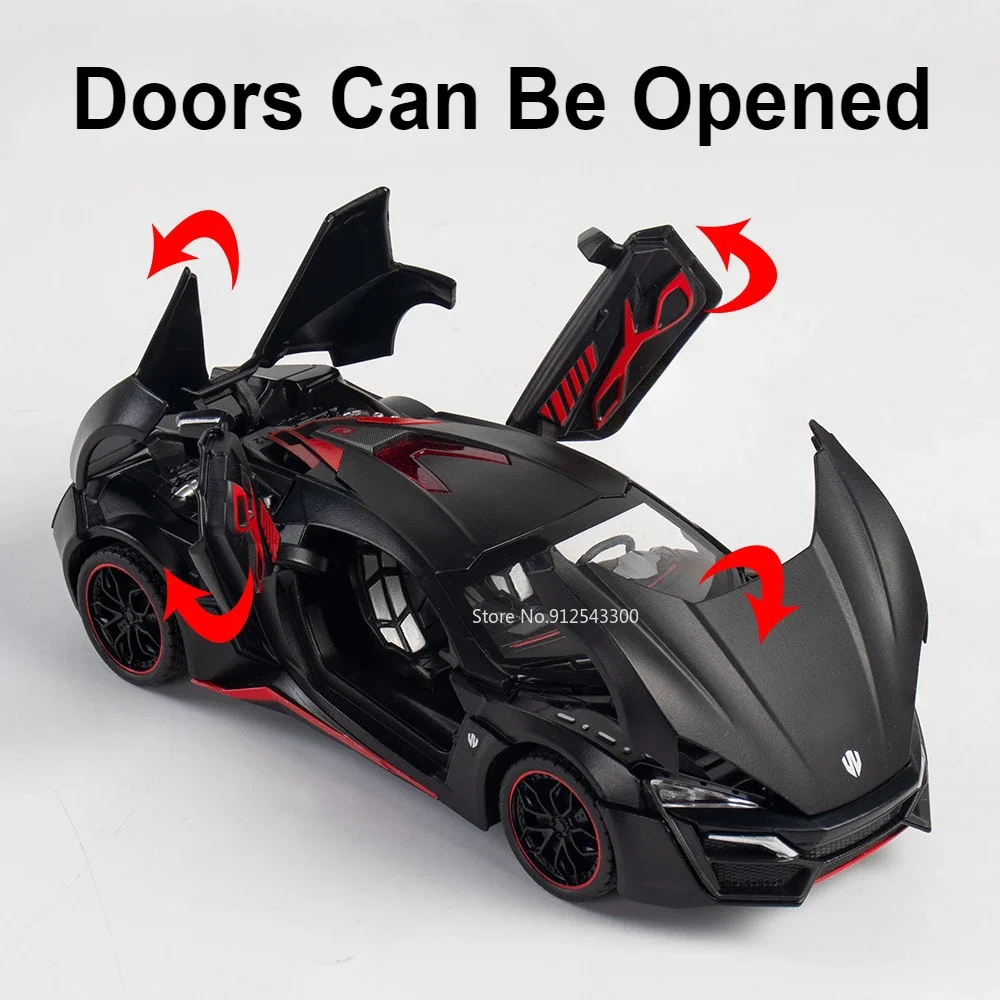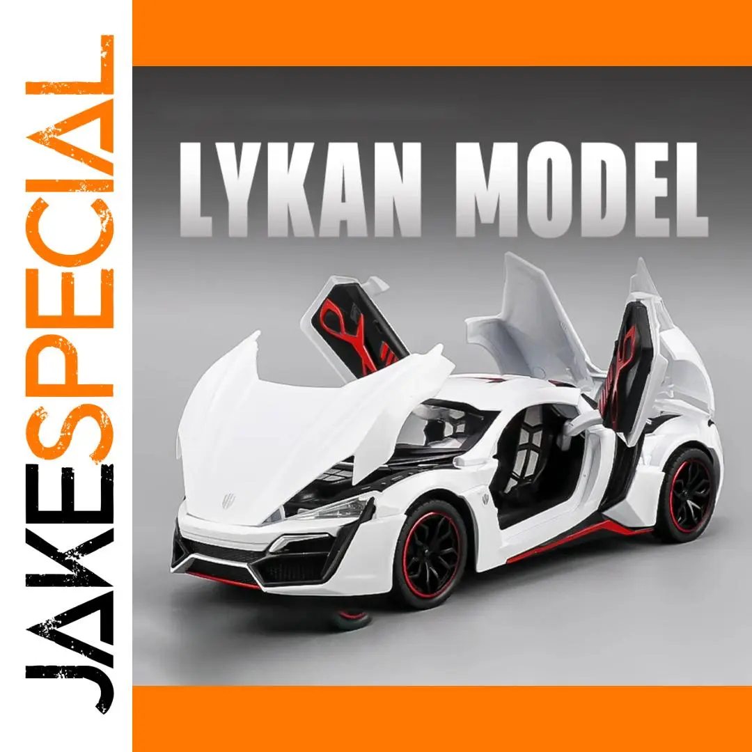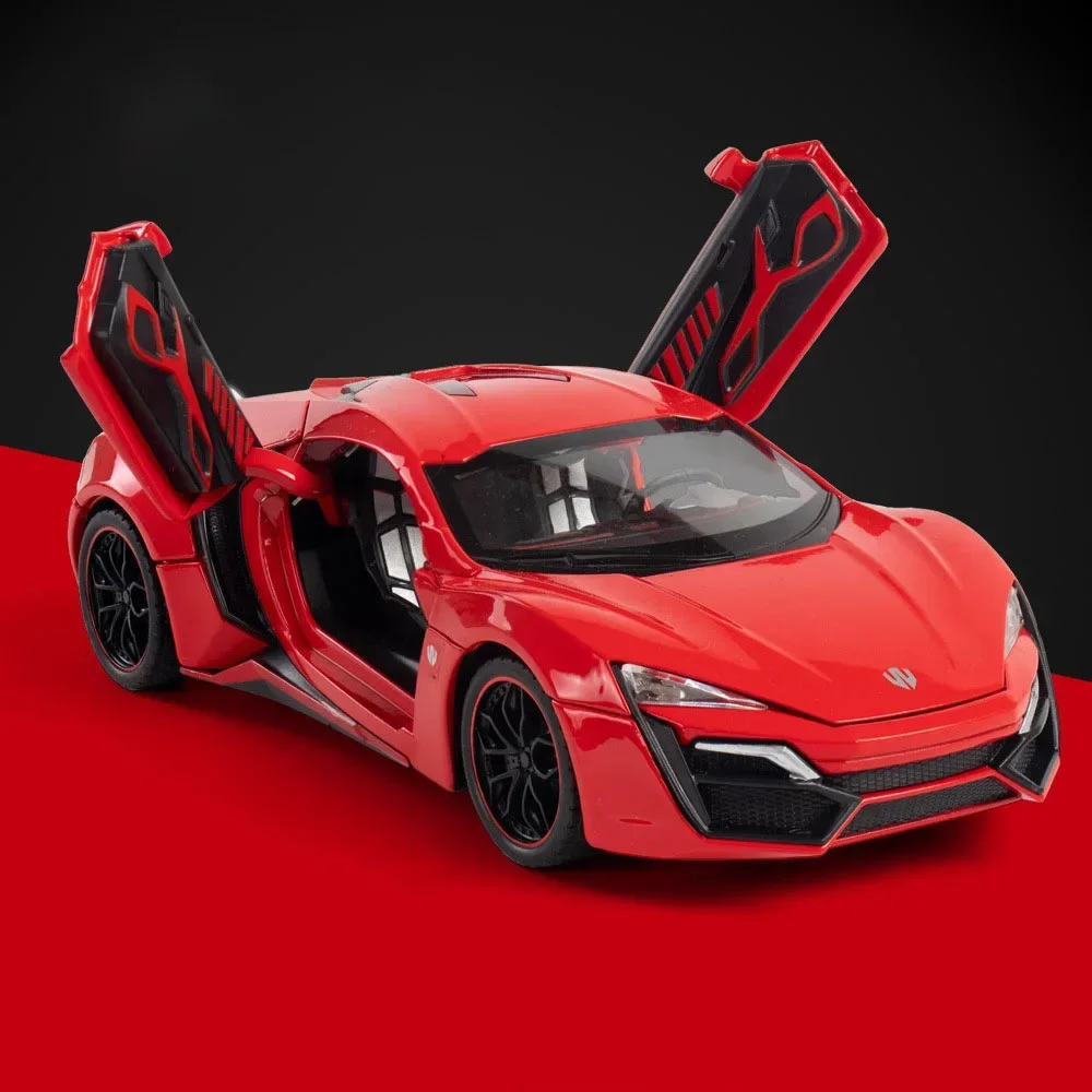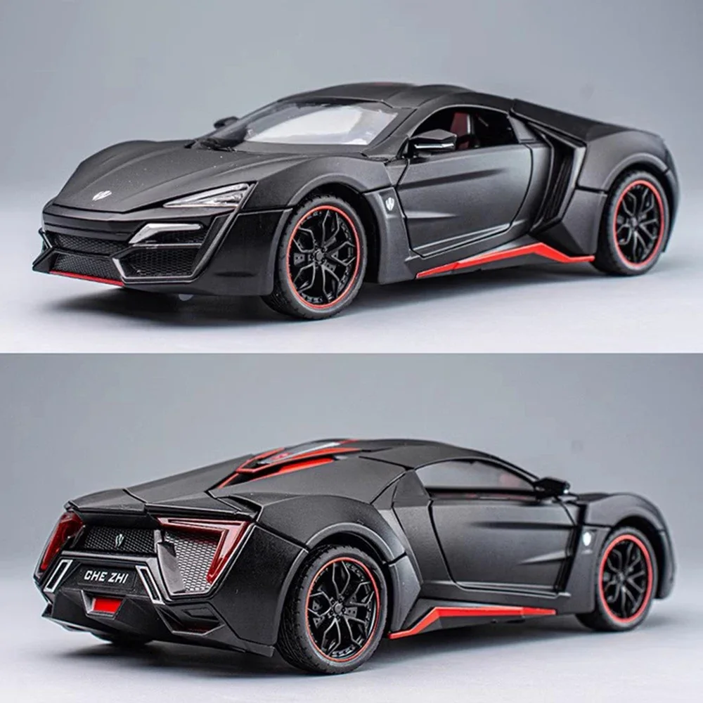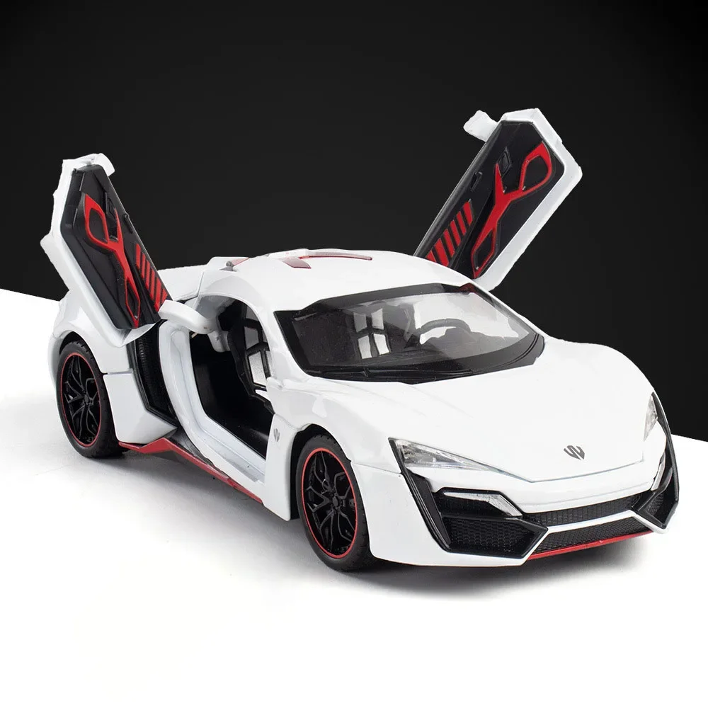 Experience the thrill of owning a high-performance, realistically detailed miniature sports car with this 1:24 scale diecast model. Crafted with a durable alloy body, it features striking design elements such as sleek contours, sharp angular headlights, and an aerodynamic body that embodies modern supercar aesthetics. Available in vibrant colors including Lykan Black, Camaro Blue, Camaro Yellow, Lykan Red, Camaro Black, and Lykan White, each model captures the essence of speed and sophistication. The model boasts open gull-wing doors revealing a meticulously detailed interior, complete with functional sound and light features for added realism. Whether for display or interactive play, this collectible enhances any enthusiast's collection with its impressive craftsmanship and eye-catching details.