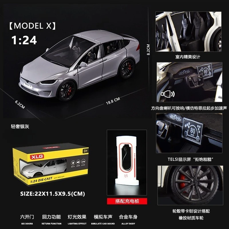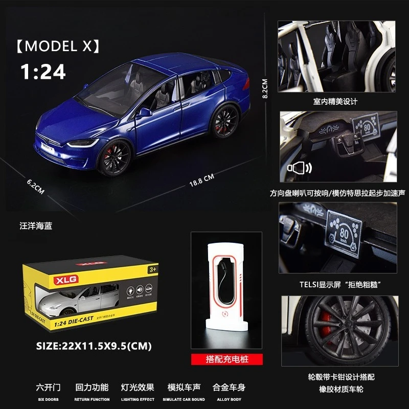 Experience the sleek elegance of this 1:24 scale diecast metal model collection, featuring highly detailed replicas of Model 3, Model Y, Model X, and Model S vehicles. Each model boasts realistic sound and light functions, capturing the futuristic design with a smooth, aerodynamic form, sharp tapered headlights, and a striking two-tone finish with a black roof contrasting the body color. Crafted from durable, high-quality metal, these collectibles are available in vibrant colors such as blue, red, gray, black, white, and purple, with various box options. Perfect for enthusiasts aged 14 and above, these models combine precision craftsmanship with safety, making them ideal for display or gifting.