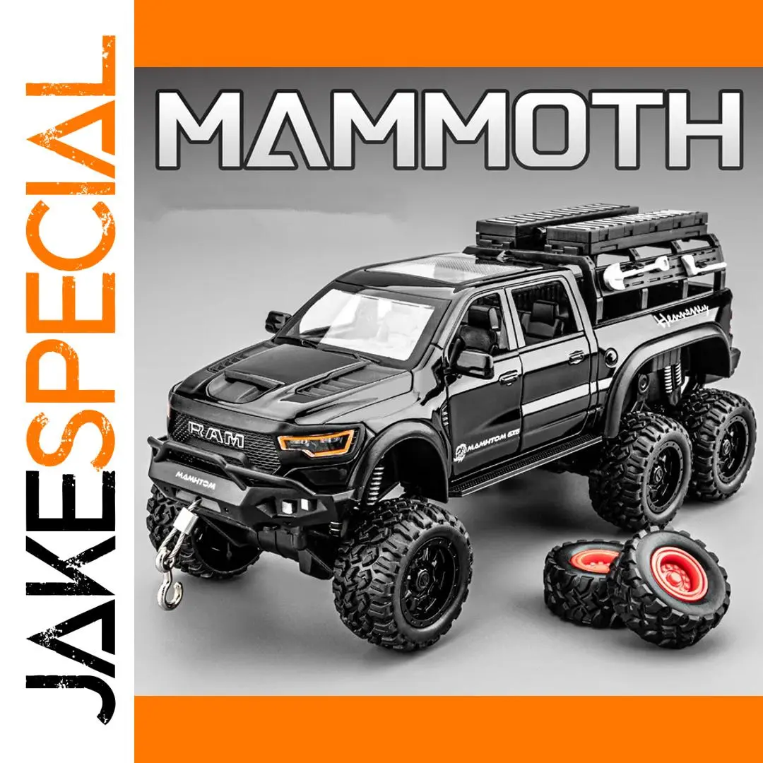 Experience the thrill of adventure with this highly detailed 1:24 scale diecast alloy replica of the Dodge T-Rex RAM 1500 pickup truck. Crafted from durable alloy and plastic, this rugged model showcases a sleek black finish with aggressive contours, sharp lines, and a muscular silhouette. The prominent grille displays a clear “RAM” logo, complemented by a sturdy bumper and a metal winch hook, emphasizing its off-road capabilities. Ventilation vents on the hood lend a sporty appeal, while the oversized, deep-tread tires mounted on black multi-spoke rims accentuate its off-road readiness. The structured roof rack, subtle “MAMMOTH” decals, and rear-mounted off-road equipment complete this adventure-ready design. With sound and light functions, this model provides realism and excitement for collectors and enthusiasts alike.