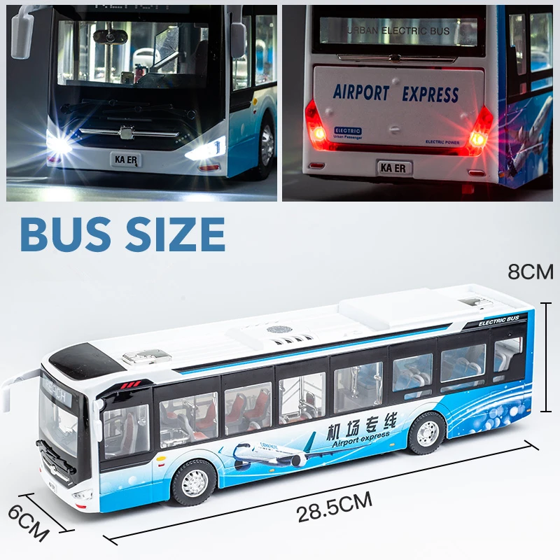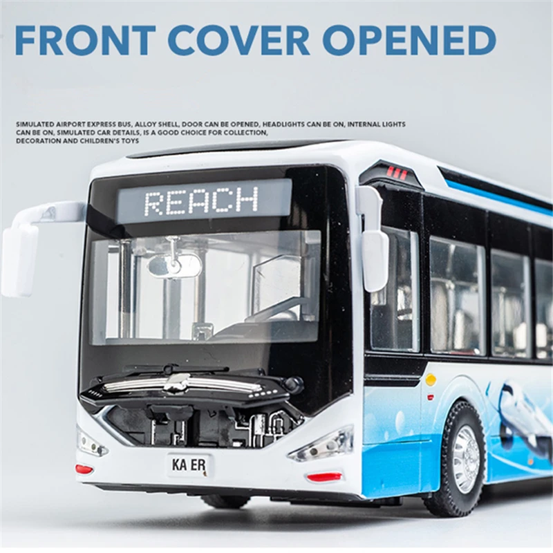 Imagine adding a sleek, contemporary touch to your display with this stunning 1:24 scale diecast electric tourist bus. Crafted from durable metal, its glossy blue finish commands attention with a vibrant, high-quality look. The aerodynamic design features smooth, rounded edges and a seamless, curved windshield that exudes futuristic elegance. Large transparent side windows reveal a meticulously detailed interior, including realistic seats and interior features that bring authenticity to life. The model’s reinforced, textured rubber tires sit on intricately detailed silver rims, providing stability and realism. Equipped with functional LED-style lights and sound operated by batteries, it promises an engaging viewing experience. This model beautifully combines craftsmanship, innovation, and style for collectors and enthusiasts alike.