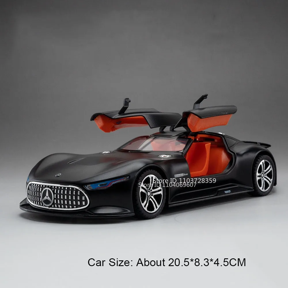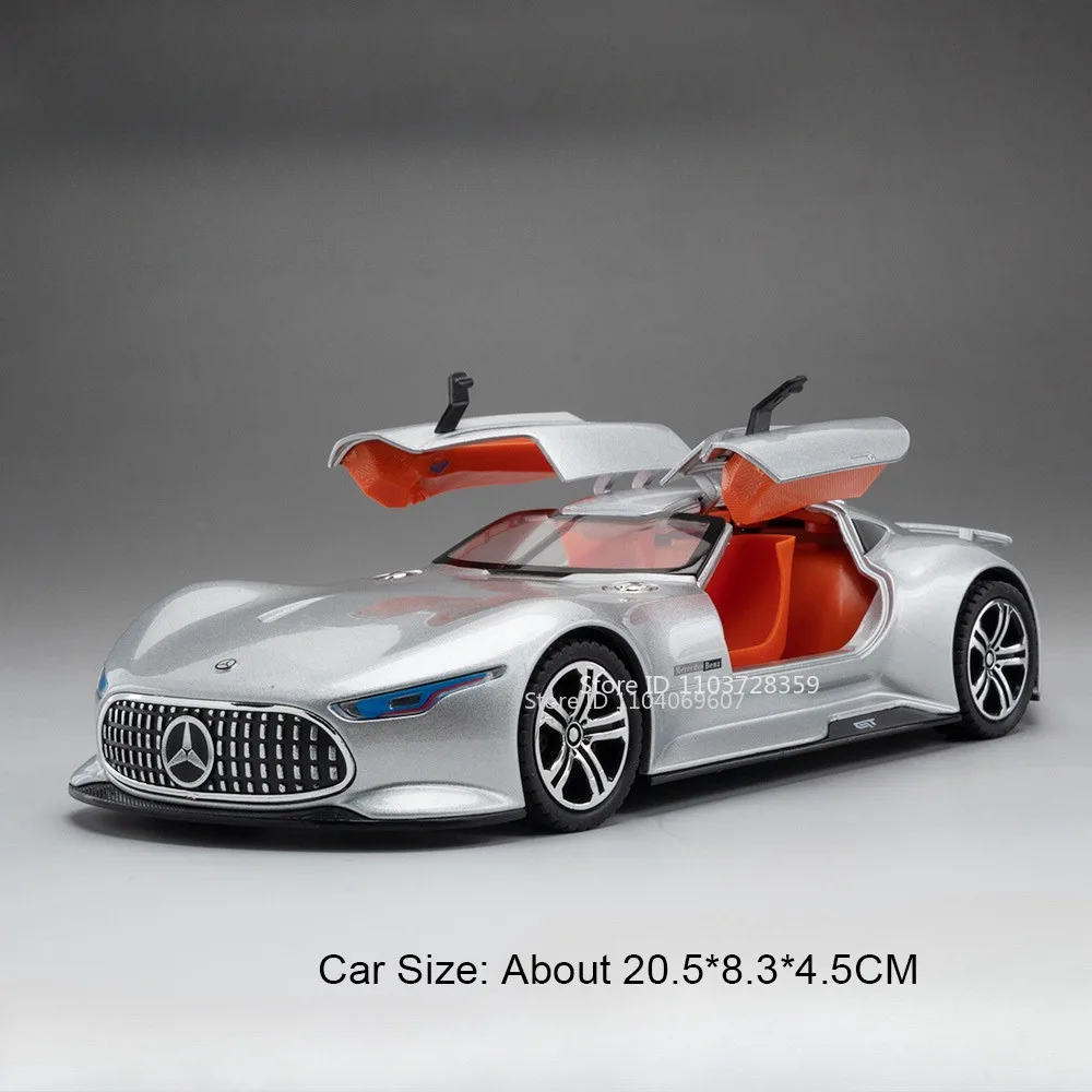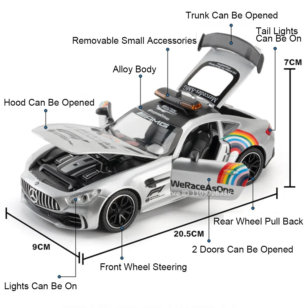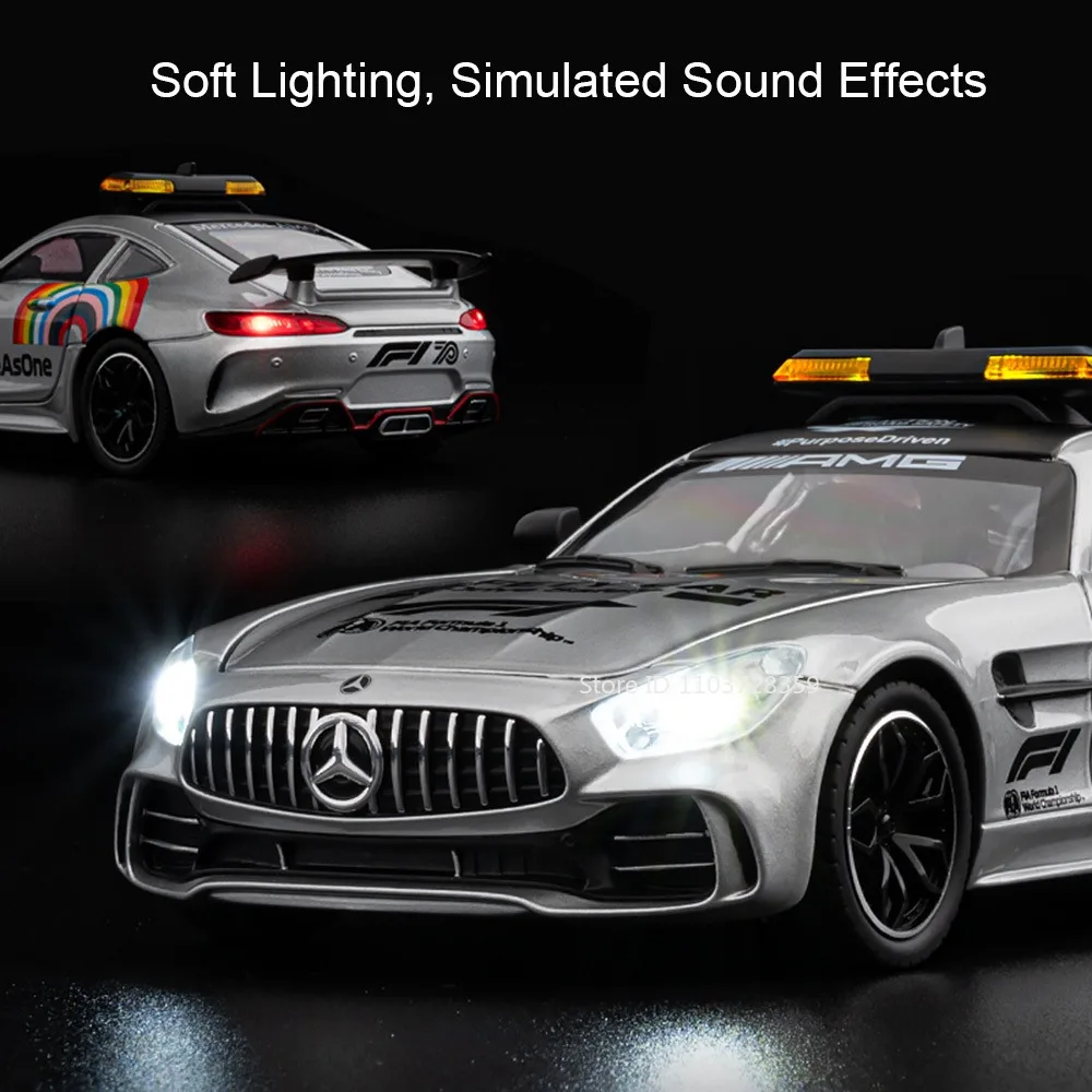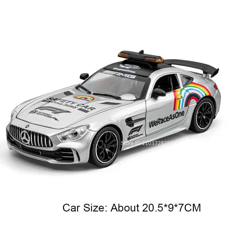 Experience the thrill of racing with this highly detailed and realistic 1:24 scale F1 Safety Car model. Crafted from durable alloy metal, it has a sleek, polished silver finish, with vivid accents like orange and yellow safety lights on the roof that bring authenticity to life. The model measures approximately 20.5 cm in length, 9 cm in width, and 7 cm in height, capturing every intricate detail from the front grille with vertical slats to the precisely rendered interior visible through transparent plastic windows. The tires are rubber with detailed treads, mounted on black alloy rims, making it both visually appealing and resilient. With sound and light features, pull-back motion, and opening doors, this model truly stands out as a high-end display piece or gift for enthusiasts.