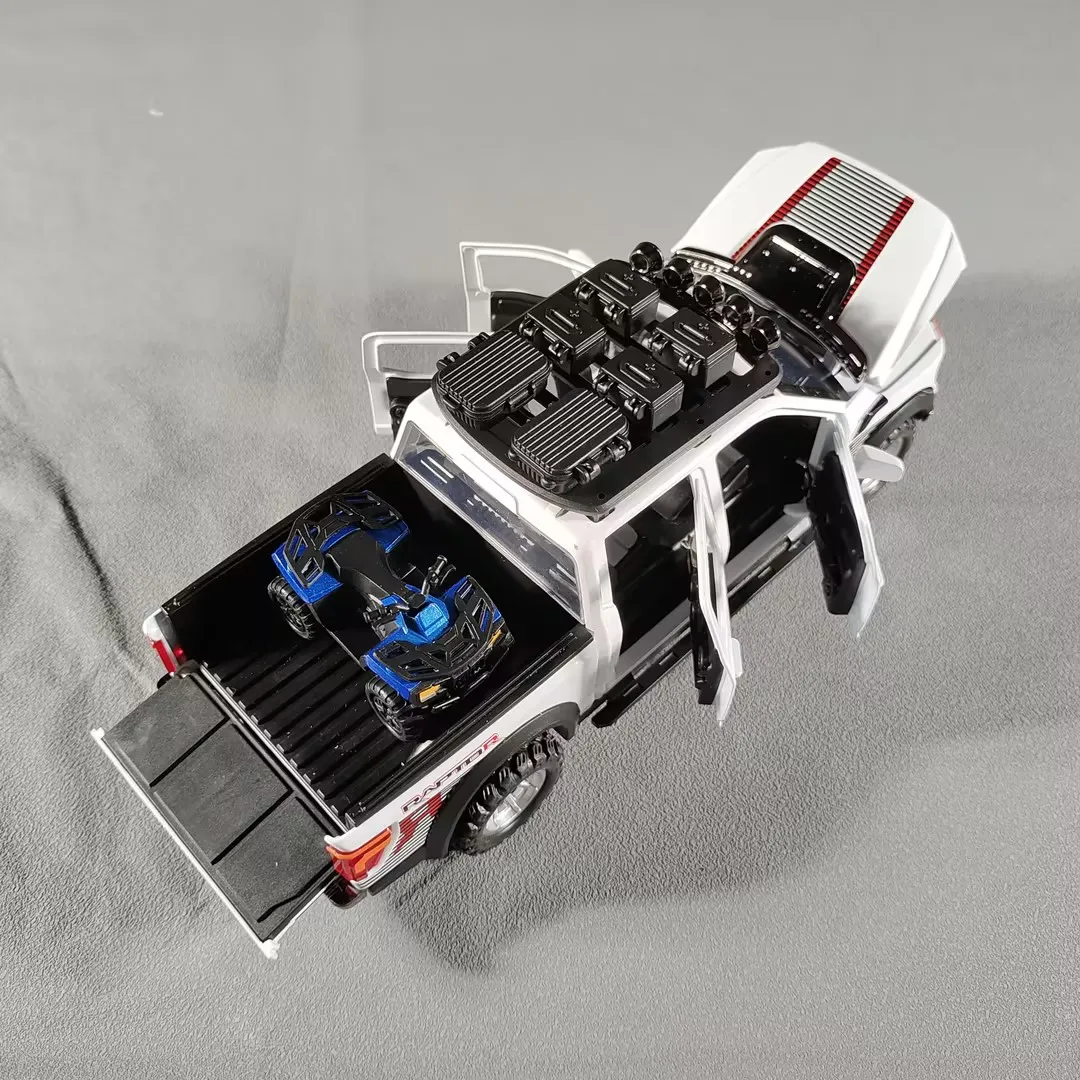 The 1:24 F150 Off Road Truck Alloy Diecast Model Car boasts a durable diecast metal construction with sound and light functions powered by a button battery. Its striking design showcases a predominantly white body with vibrant red and black accents, a detailed chrome front grille, integrated headlights, and a sporty hood featuring black stripes. The model includes a black roof rack with a small blue off-road vehicle, mounted light fixtures, and textured black rubber wheels, enhancing its rugged aesthetic. Intricate details like door handles, a side step, and small black storage case accessories make it a unique collectible piece, perfect for display or gifting.