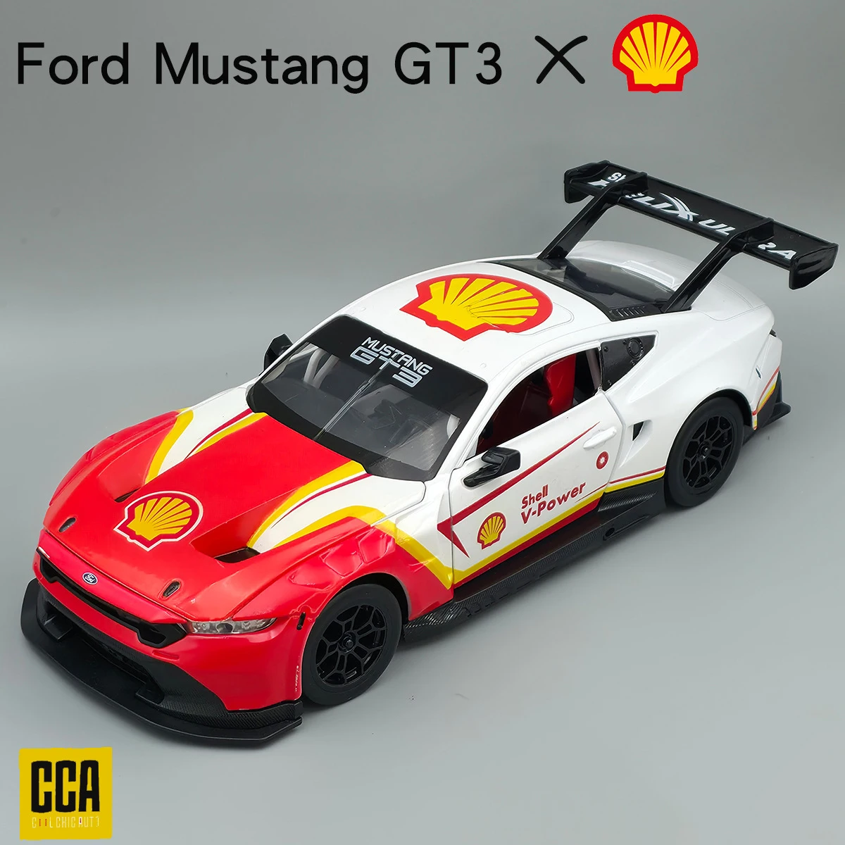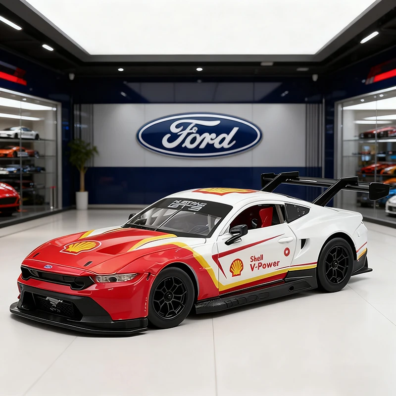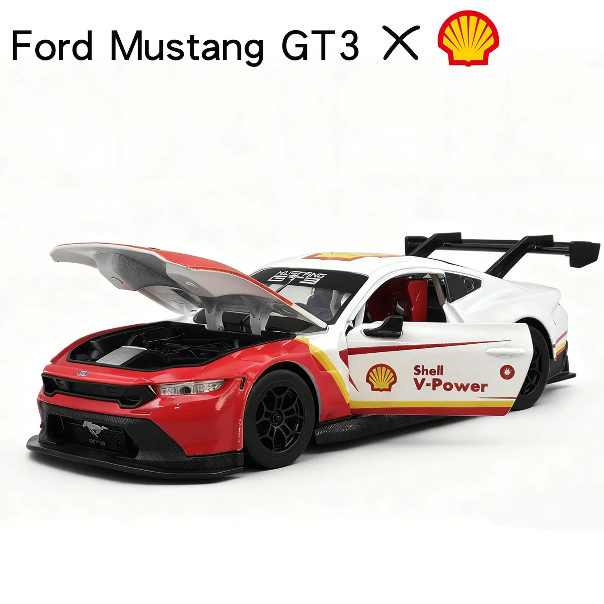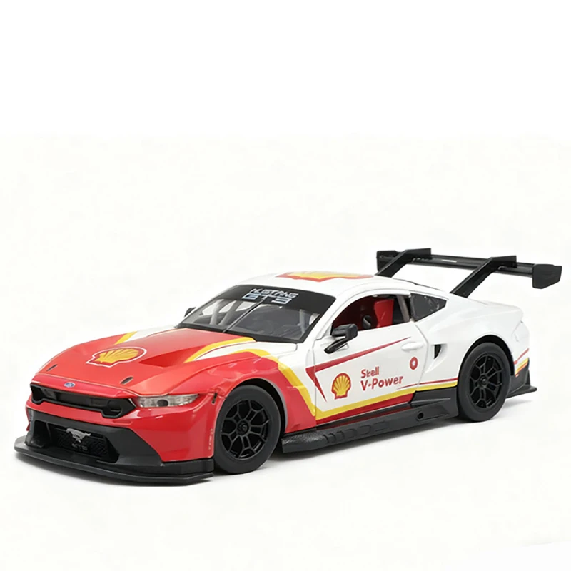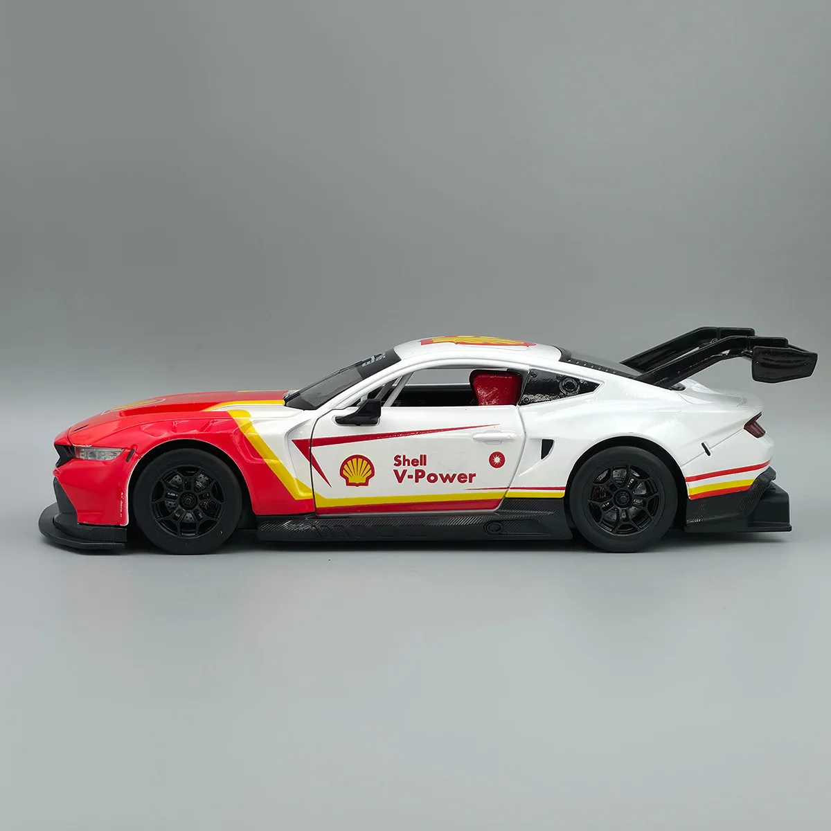 This 1:24 scale Ford Mustang GT3 alloy car model features a striking red and white color scheme, prominently displaying Shell's “V-Power” branding. Constructed from durable diecast alloy and plastic, this meticulously detailed model showcases various elements, including an aggressive low-profile bumper and a streamlined elevated hood that reveals a detailed engine compartment. The intricate interior, complete with a detailed dashboard and sporty racing seats, is accessible via open doors. Black wheels enhance its sporty look, while a large aerodynamic spoiler at the rear emphasizes its performance capabilities. This model is perfect for display or play, embodying the exhilarating spirit of motorsport.