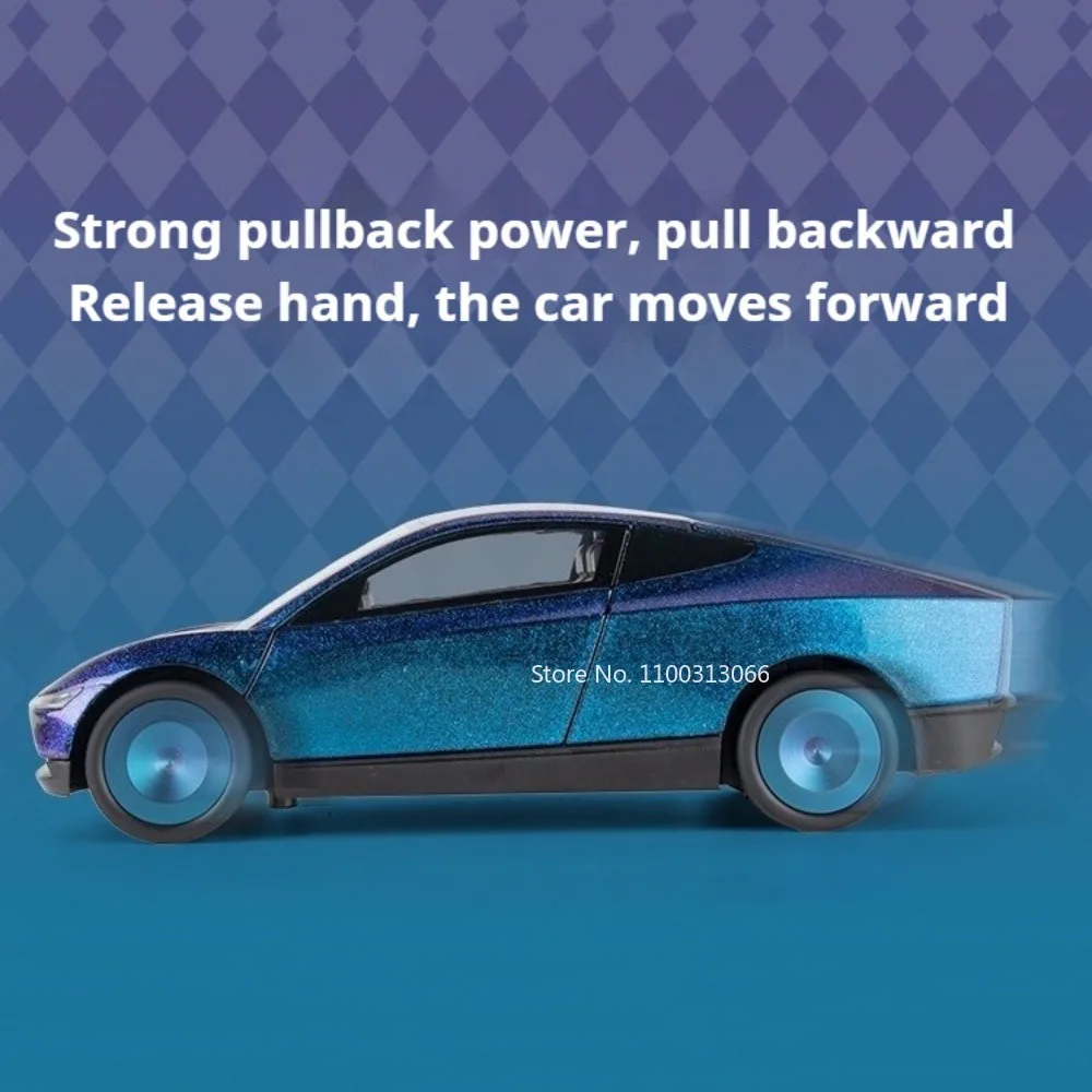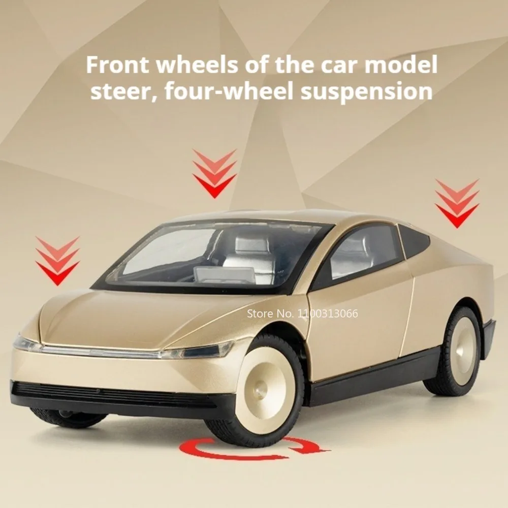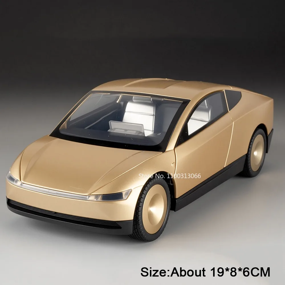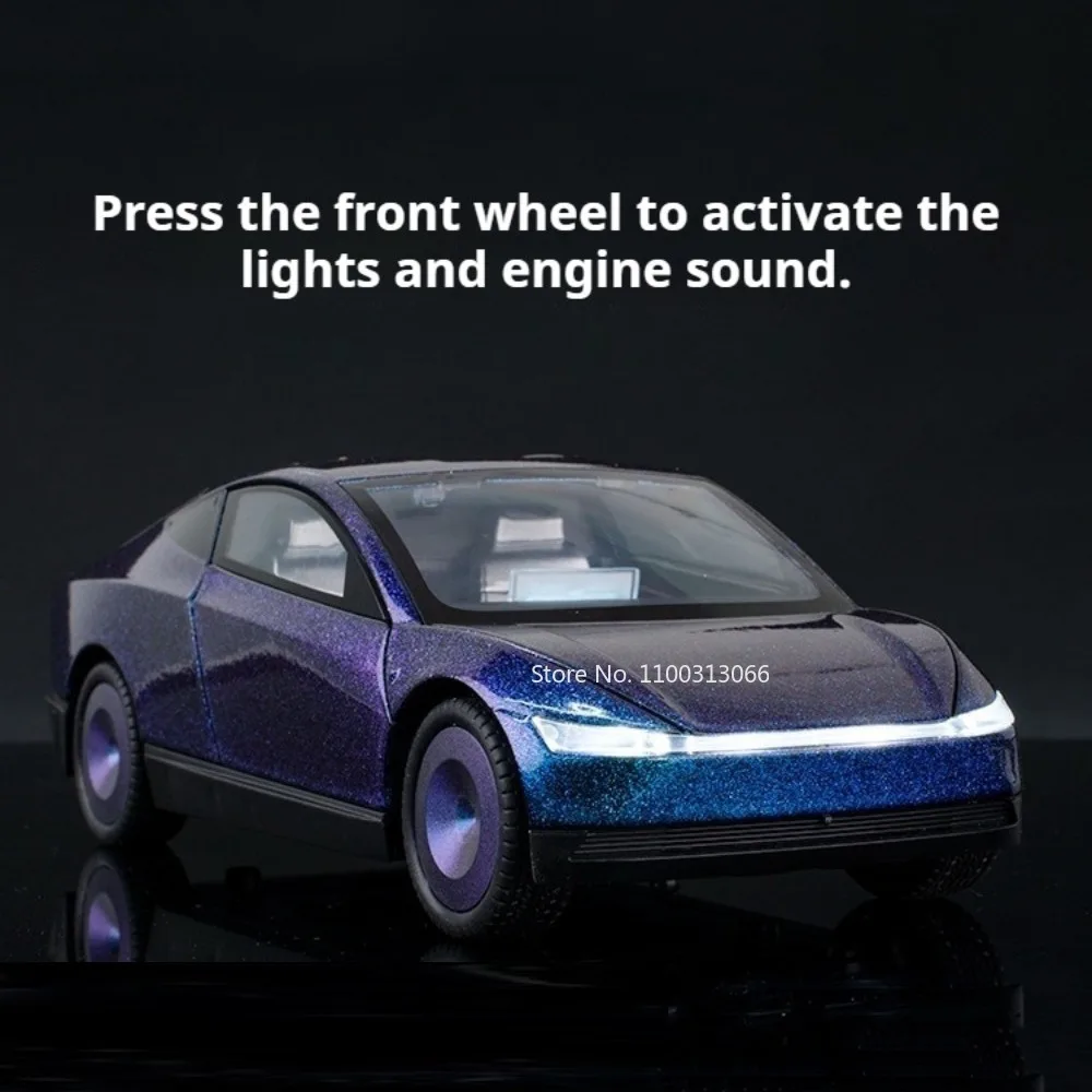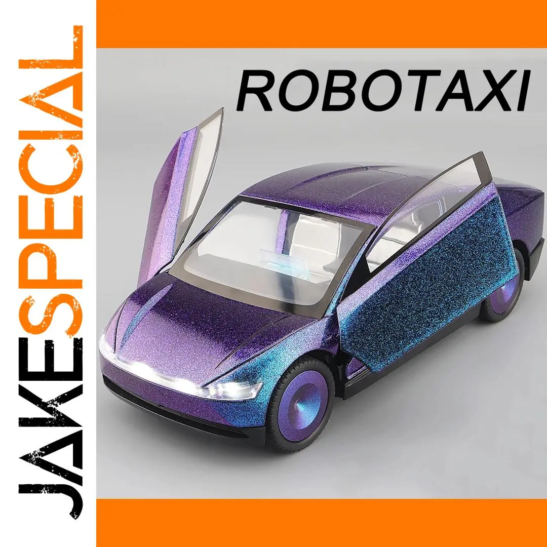 Experience the futuristic charm of this high-quality 1:24 scale robotaxi model Y car, meticulously crafted to captivate adult collectors and enthusiasts alike. Featuring a dazzling, iridescent finish with a vibrant gradient of purple, blue, and pink hues, the surface shimmers with a metallic sparkle under light. Its sleek, aerodynamic design includes a smooth, curved roof, streamlined rear, and sharp styling lines that give it a modern, high-tech appearance. The large, transparent windshield reveals a minimalistic interior, while butterfly-style doors open upwards for a dramatic effect. Small rubber tires and vivid purple accents perfectly complete this mini masterpiece, making it an ideal decorative piece for any display shelf or office table. Indulge in this eye-catching, futuristic collectible today.