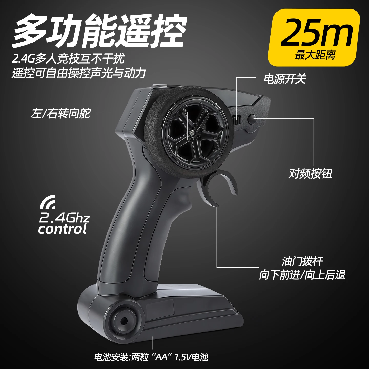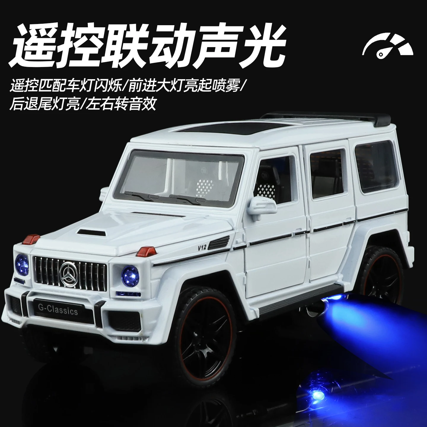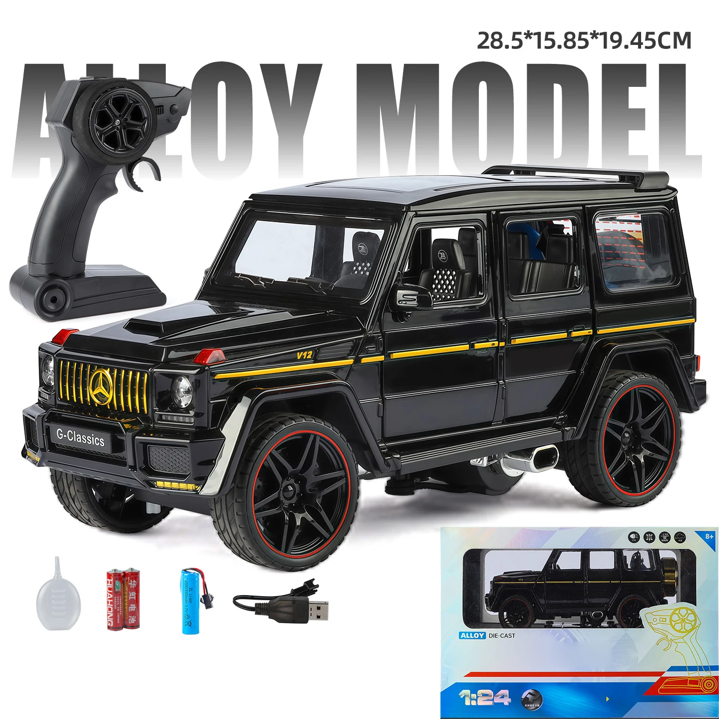 Experience the thrill of off-road adventures with this 1:24 scale RC car featuring a durable diecast alloy body finished in sleek black or white. Designed for enthusiasts aged 14 and above, it offers realistic detail with smooth, polished surfaces and bold off-road-inspired features like large, chunky tires with deep treads and striking red-rimmed black wheels. The vehicle boasts a detailed front grille with vertical bars and a yellow Mercedes-Benz star emblem, circular black housing headlights with clear lenses, and shiny black side mirrors. Powered by batteries (included) and equipped with remote control, this model makes an ideal collectible or hobby piece for any enthusiast’s display or play collection.