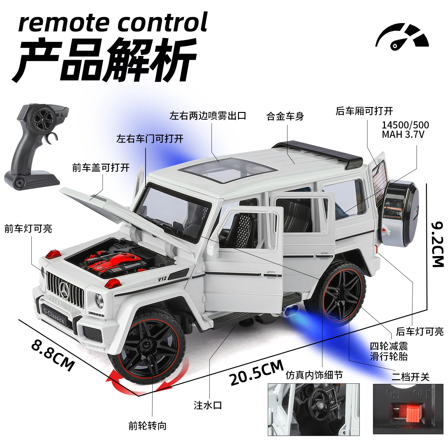 - This 1:24 scale RC car is crafted with a metal alloy diecast body, offering durability and a luxurious look similar to the real G63 SUV. Its detailed exterior and realistic features make it stand out.