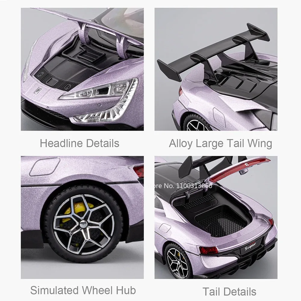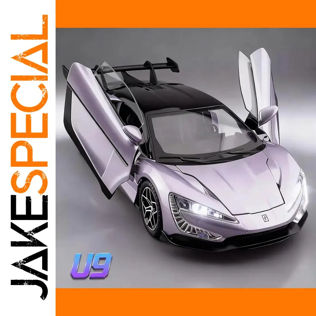 Immerse yourself in the thrill of owning this finely crafted 1:24 scale high simulation car model, designed to captivate enthusiasts and collectors alike. Crafted with a durable zinc metal body, plastic chassis, and realistic rubber tires, this miniature showcases the sleek aesthetic of a luxury supercar. Its aerodynamic silhouette features sharp angles, subtle contour lines, and a polished metallic finish in shades like Silver, Purple, and vibrant Sian Yellow, adding a touch of sophistication. The functioning gull-wing doors open smoothly, revealing a detailed interior. Equipped with sound and light effects plus a pull-back mechanism, this model brings excitement and realism. Measuring approximately 20.3 x 9.5 x 5.3cm for the U9 and 22 x 10 x 5cm for the Sian, it’s perfect for display or educational play.