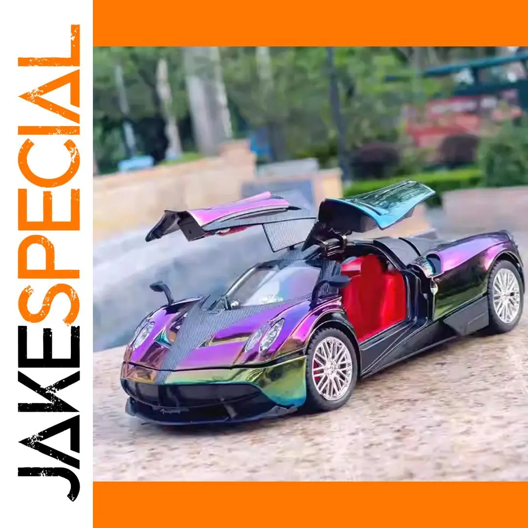 Imagine owning this highly detailed miniature sports car, meticulously crafted to resemble a true Pagani Huayra. Its captivating iridescent finish shifts between purple, blue, and green, creating a mesmerizing metallic shine. The sleek, aerodynamic design boasts smooth curves, intricate grillework, angular headlights, and vents for an authentic look. With four functional doors, you can open and explore the detailed interior with red accents, adding to its realism. This model features alloy-style multi-spoke wheels and textured rubber tires, enhancing its luxurious appearance. Designed to impress collectors and enthusiasts, this durable diecast car also incorporates light and sound effects, making it a perfect display piece or interactive toy.
