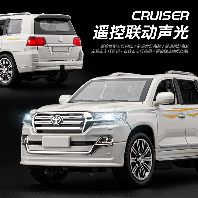 Experience the thrill of off-road adventures with this highly detailed 1:24 scale Land Cruiser RC car. Crafted from sturdy alloy metal diecast, it mimics the authentic design of the legendary SUV, featuring a sleek black glossy finish or a clean white box option. Its sturdy construction ensures durability during rough terrains and playful racing. With realistic front grille details, LED-style headlights, sculpted hood lines, and textured chunky tires, this model captures the rugged and sophisticated look of an actual Land Cruiser. The tinted windows reveal detailed interior seats, while the proportional side mirrors and body panels enhance its authentic appearance. Perfect for both display and off-road fun, this remote-controlled vehicle guarantees hours of engaging play.