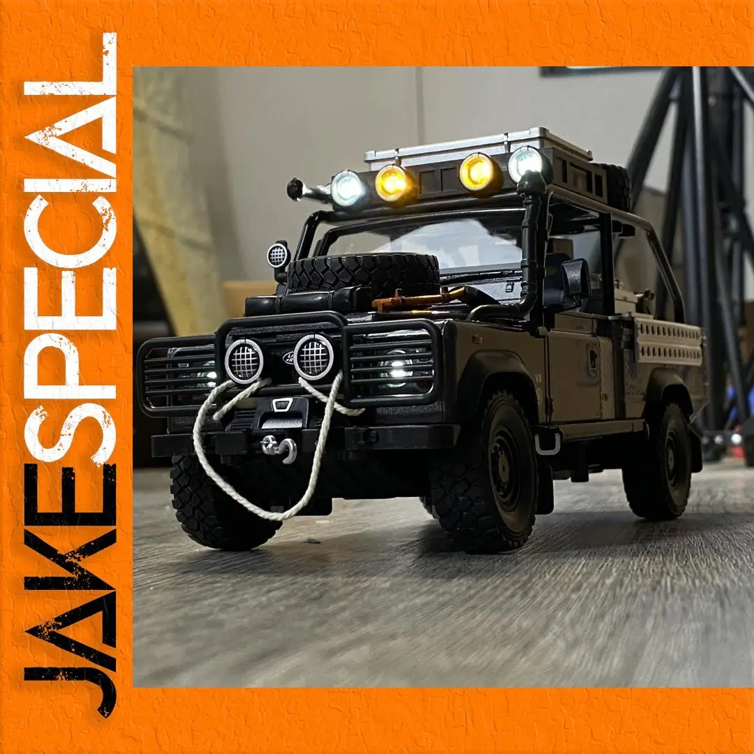 This exquisite 1:24 scale Land Rover Defender 90 diecast model car is styled after the iconic “Tomb Raider” theme, making it a stunning collectible for enthusiasts. Its dark grey finish evokes a rugged off-road allure, demonstrating a well-crafted design that mirrors the authentic SUV's features. The model displays intricate details, including a prominent grille and round headlights, while additional lighting and a towing hook enhance its adventurous character. The low-profile rubberized tires with realistic tread patterns complete its robust look. Whether you’re adding to your collection or gifting to a fellow fan, this model is sure to impress with its unique design and attention to detail.