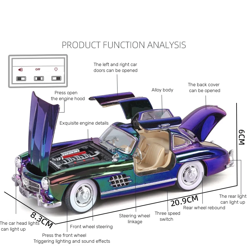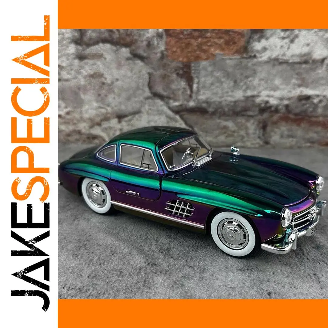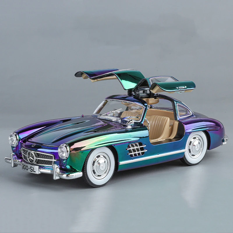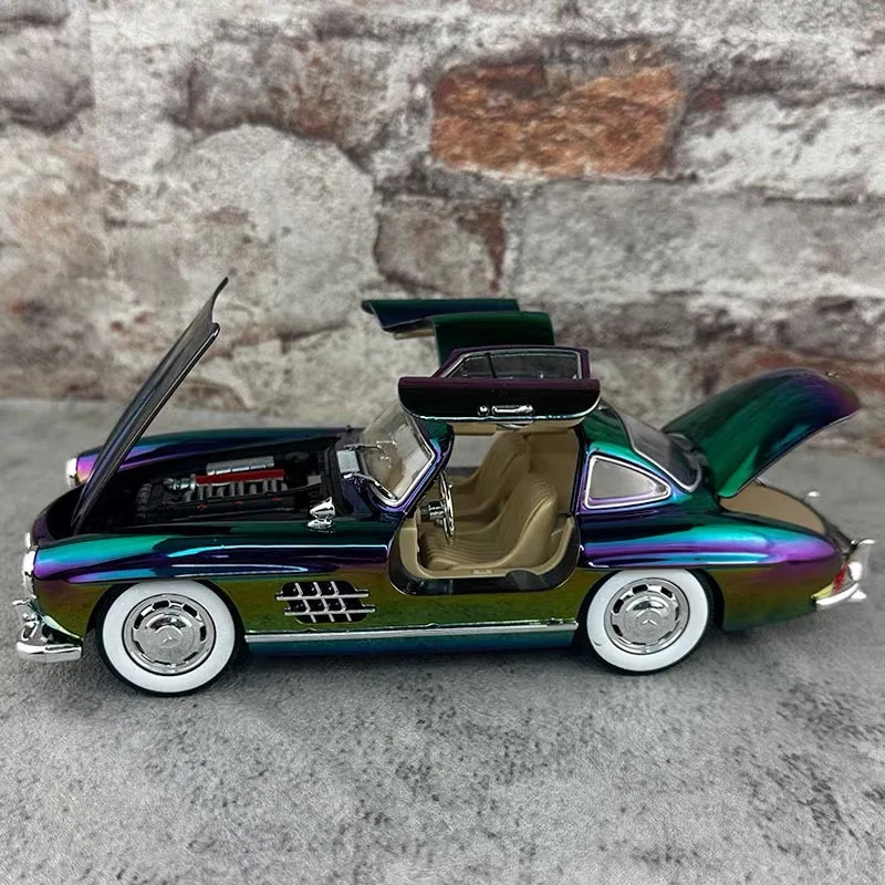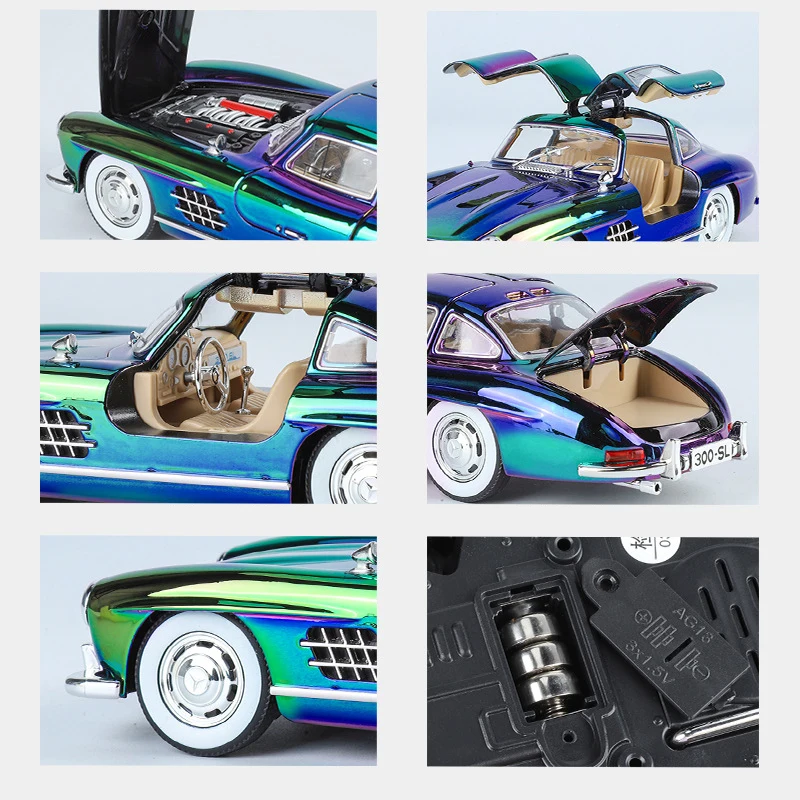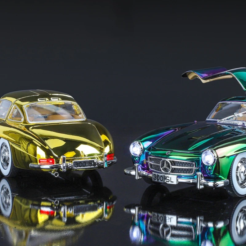 Experience the beauty of this meticulously crafted 1:24 scale Mercedes-Benz 300SL diecast alloy model, finished with a mesmerizing electroplated surface that shifts between green, purple, and black hues. Its sleek, smooth body highlights classic vintage design features, such as rounded fenders, low profile, and distinctive side vents. The model's reflective paint combined with chrome accents on the bumper, side mirrors, and window frames creates a highly realistic, polished appearance perfect for display or collection. White wheels with metallic hubcaps and black treaded tires lend further authenticity. Designed to captivate, this model also includes functional sound and light features, elevating its decorative appeal. Whether you’re a collector or a passionate enthusiast, this iconic car embodies timeless elegance and craftsmanship.